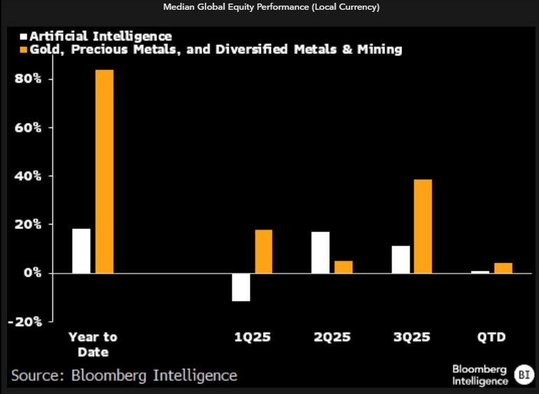 A Bloomberg információi szerint az idei év sztárbefektetései a részvénypiacon az aranybányász és royalty részvények voltak, melyek négyszeresen túlszárnyalták a nagy sztárnak tekinthető AI részvényeket. A Bloomberg által figyelt 48 aranybánya és royalty részvény 84%-kal értékelődött fel a helyi devizában számolva, míg a 122 AI részvény az MSCI ACWI indexben összesen 18%-kal lett drágább idén. Az aranyat a „dedollarizáció”, az újraéledő inflációtól való félelem és a központi bankok vételei emelték a magasba. Az arany hosszútávú várható áralakulása továbbra is pozitív, több elemzőház is ötszámjegyű aranyárat lát reálisnak még ebben az évtizedben.