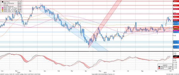 A múlt heti lokális csúcsra ugrást követően korrigált az USDJPY árfolyama, a 150,9-es szintig táncolt vissza. Itt viszont elfogyott a lendület, felpattanni látszik a jegyzés. A Fed lehetséges kamatvágásainak elhintése Jerome Powell részéről és a japán jegybank egyre inkább elodázott kamatemelése irányban eltér ugyan, de a hatásuk nagyjából kiegyenlíti egymást, így oldalazás következhet.