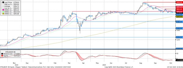 Az elmúlt napokban elesett az 1.800-as támaszszint, így a következő támaszt az augusztusban 1.760 forintnál hagyott rés jelenti. A következő napokban az árfolyam oldalazása tűnik a legvalószínűbbnek.