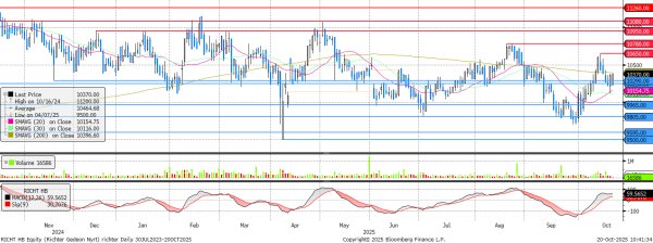 A 200 napos mozgóátlagig emelkedett a Richter árfolyama, ami ellenállásként funkcionálhat a következő napokban, és ami megállíthatja az árfolyam felpattanását. Támaszt ismét a 10.250 és 10.290 forintos szint jelent. A Richter amerikai értékesítési partnere, az AbbVie október 31-én publikálja negyedéves jelentését.