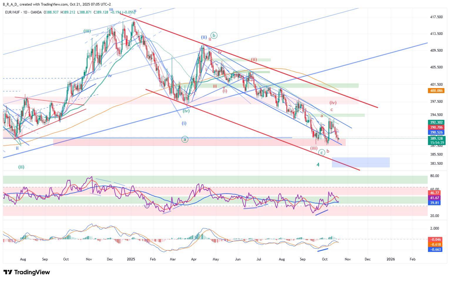 Az eső csatorna aljáig jutott az árfolyam, mely a következő napokban megállásra és legalább egy kisebb korrekció megindulására késztetheti az árfolyamot. A korábban kialakult – nem fordulós - divergenciát követően megjelenhet a charton egy konvergencia, mely szintén egy emelkedés lehetőségének irányába mutat.