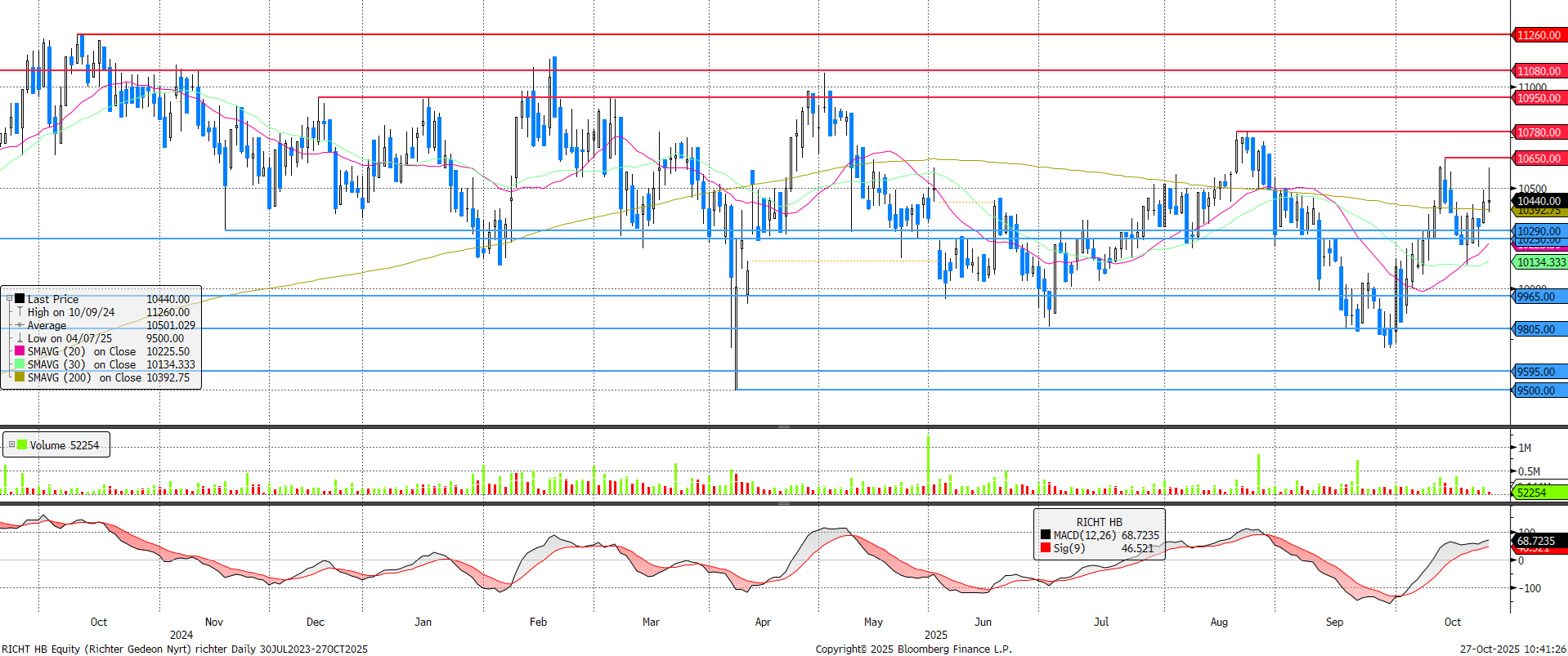 Sikerrel törte át a 200 napos mozgóátlagot a Richter árfolyama, és ezzel megnyílt az út a további emelkedés előtt. Pénteken érkezik az amerikai értékesítési partnerének, az AbbVie-nek a gyorsjelentése, jövő hét csütörtökön pedig a Richter teszi majd közzé harmadik negyedéves jelentését, így izgalmas napok előtt áll a Richter. A következő ellenállást az októberi lokális csúcs jelenti 10.650 forintnál.