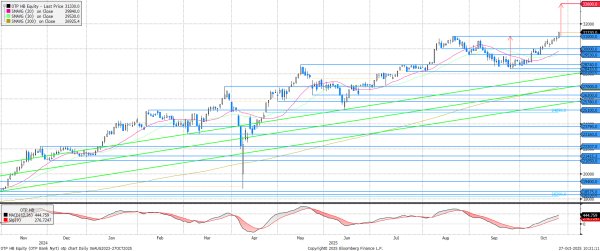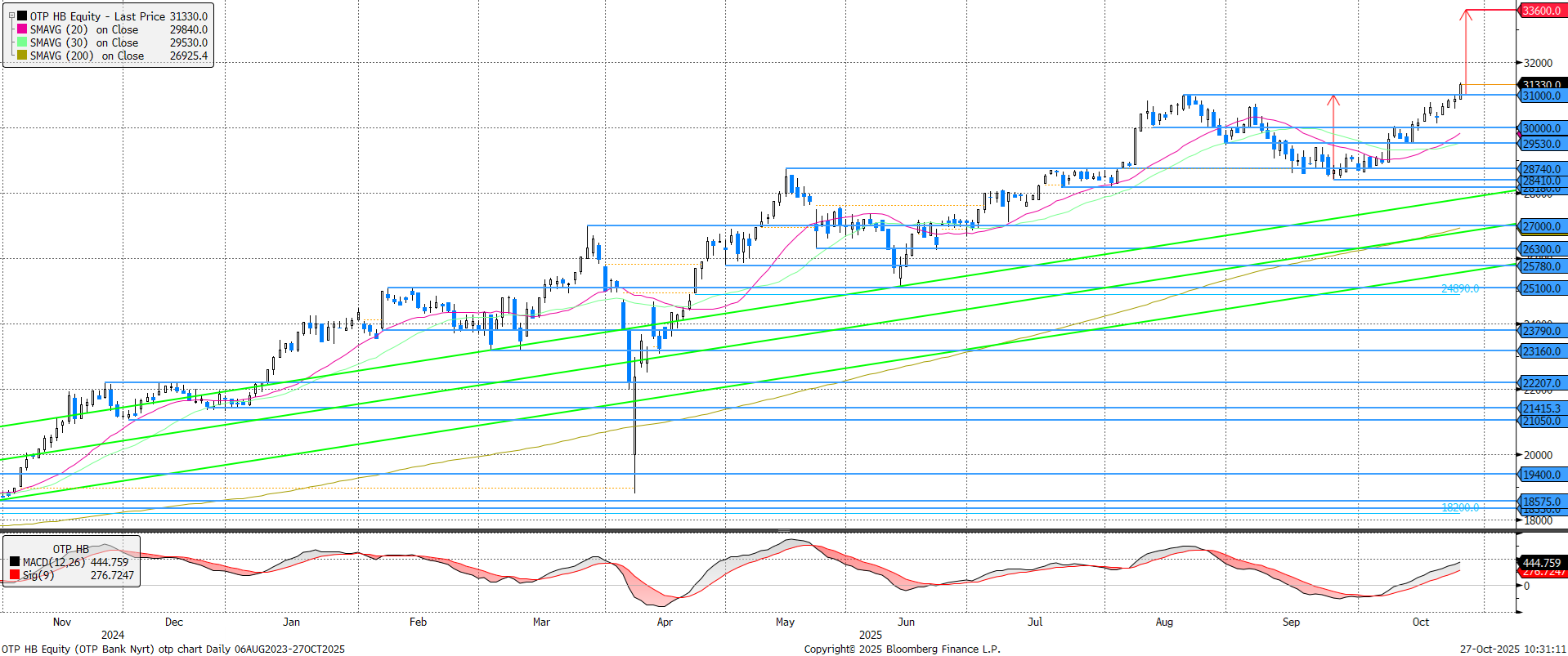 Új történelmi csúcsra emelkedett ma reggel az OTP árfolyama, és bár az RSI indikátor értéke közelíti a túlvettséget jelző 70-es értéket, a technikai kép mégis a további emelkedés irányába mutat. Az alakzat alapján nagyjából két hónapos időtávon, vagyis év végéig akár 33.600 forintig is emelkedhet az OTP árfolyama. Támogatja az emelkedést, hogy az OTP sajátrészvény-visszavásárlási programjából még 71,4 milliárd forint maradt, melyet az év végéig költhet el a bank, bár nem kötelező a teljes keretösszeget felhasználni.