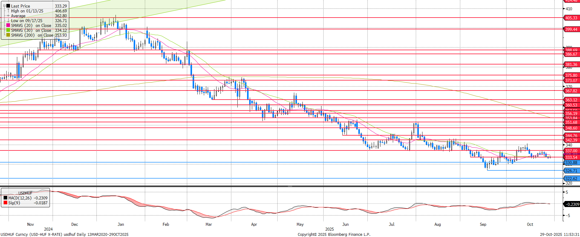 A 333,5-ös szint alá verekedte magát a forint a dollárral szemben. A 30 napos mozgóátlag 334,1-es szintje elsőkörben megfogta a trendfordulós próbálkozást, az MACD az ellaposodást követően pedig mintha eladási jelzést készülne adni. A technikai képet viszont a világ történései hamar felülírhatják, mivel a héten vár még ránk Fed kamatdöntő ülés (az ezt követő megszólalások hozhatnak izgalmat) és egy Hszi-Trump találkozó is amerikai oldalról, hazai pályán pedig GDP adatok és termelői árak befolyásolhatják az USDHUF jegyzést.