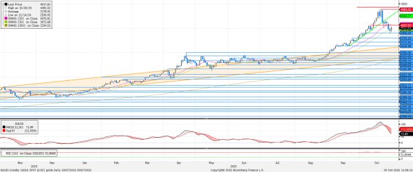 Folytatódott a múlt heti profitrealizálás adta korrekció, rövid időre az arany unciája a 3900 dollár alá is benézett. A hét közepén tűnik először úgy, hogy megtörni látszik a trend, a vevői nyomásra visszakerült 4000 dollár fölé az árfolyam. Bár korai lenne kijelenteni, hogy innen folytatódhat tovább az erősödés, az elmúlt fél év bizonytalansága nem tűnt el maradéktalanul.