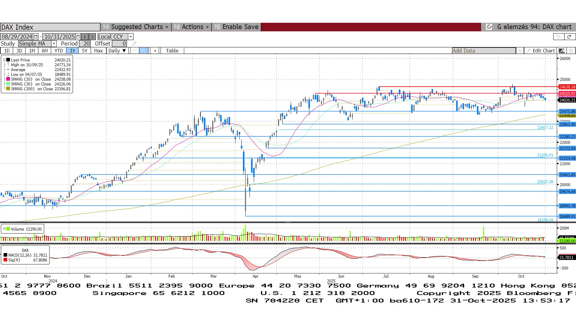 A múlt hét végén emelkedéssel zárt a DAX, és hétfőn is feljebb kapaszkodott, de a 24.326 pontos ellenállás az útjába állt. Végül nem sikerült áttörni ezt a szintet, és lefordulás következett, aminek során elesett a 30 napos mozgóátlag is. Támasz csak 23.476 pontnál húzódik, így folytatódhat a korrekció. Az orosz-ukrán háború lezárásával kecsegtető budapesti békecsúcs elmaradása sem segíti a hangulatot.