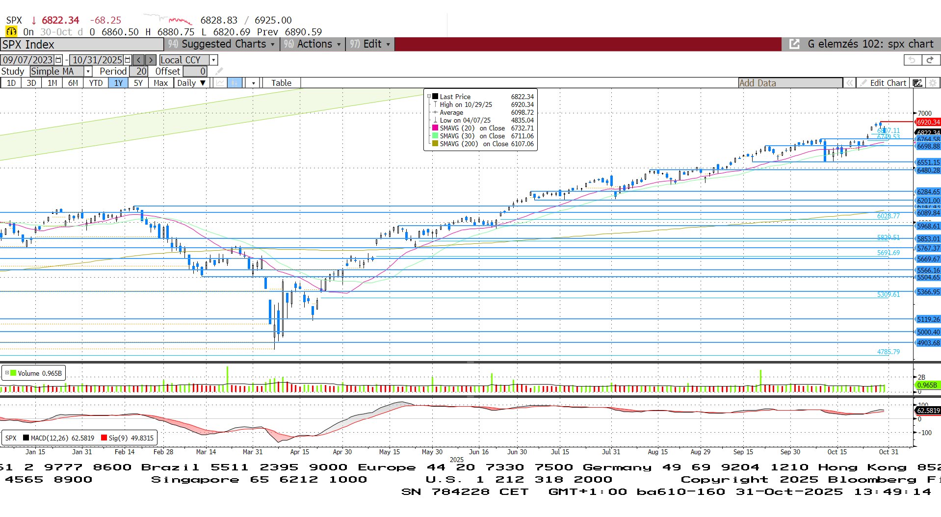 Az USA és Kína közötti kereskedelmi megállapodás hírére felpattantak a tőzsdék. A Fed a várakozásoknak megfelelően folytatta a kamatvágást, de a jegybankelnök figyelmeztette a piacot, hogy a decemberi ülésen nem szabad készpénznek venni az újabb csökkentést. A befektetők a részvények eladásával reagáltak, ugyanis előtte biztosnak tűnt az év végi kamatvágás. Az MACD indikátor nem fordult negatívba, és az erős vállalati eredmények is segítik a tőzsdéket, a kereskedelmi feszültségek enyhülése pedig további hátszelet biztosíthat, így sikerülhet elkerülni az esést.