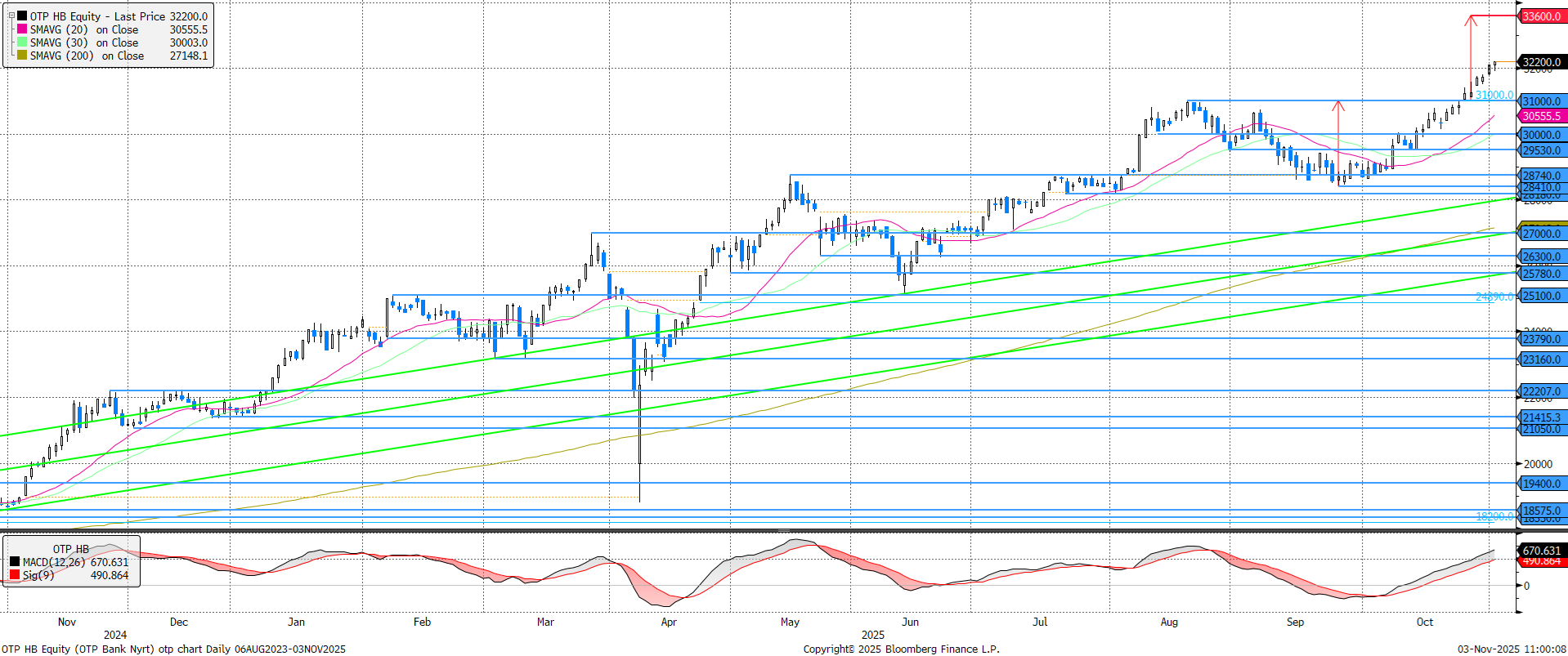 Október eleje óta száguld az OTP árfolyama, és még nem látni hol a vége. A technikai kép alapján a 33.600 forintos árfolyam tűnik lehetséges célnak. Az RSI indikátor értéke 76 pont, ami enyhe túlvettségre utal, bár ez az elmúlt napokban sem zavarta az OTP-t. A bank péntek hajnalban teszi közzé harmadik negyedéves gyorsjelentését.