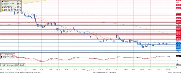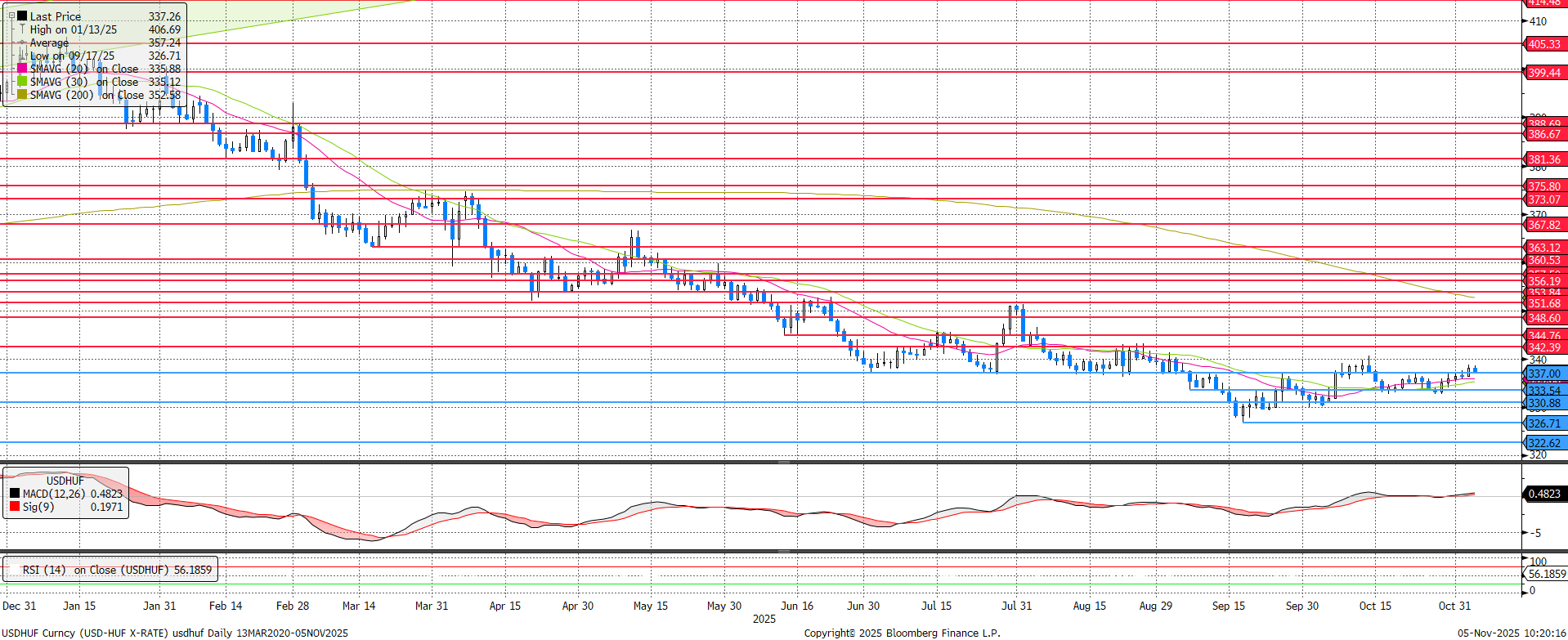 Az idei év második felében az egyik legfontosabb szint (337) fölé került az USDHUF árfolyam, amivel trend szinten folytatódni látszott az emelkedés. Az MACD minimálisan ebbe az irányba mutat, viszont az elmúlt időben több, a dollárnak kedvező esemény árazódott be. Az eladói nyomás pedig visszaszorította a 337-es támaszig jegyzést, az RSI inkább oldalazást vetít előre.