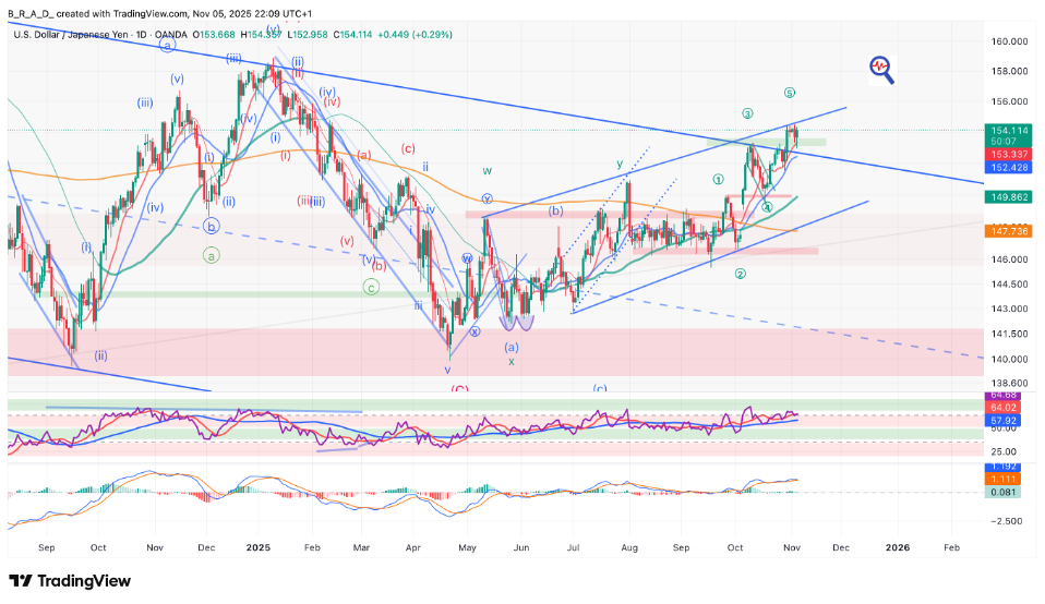 A következő időszakban egy felszúrás lehetősége mellett esésre számítunk, melynek az elsődleges célára 153,200, a másodlagos 152,777, a harmadlagos, távoli 150,800.