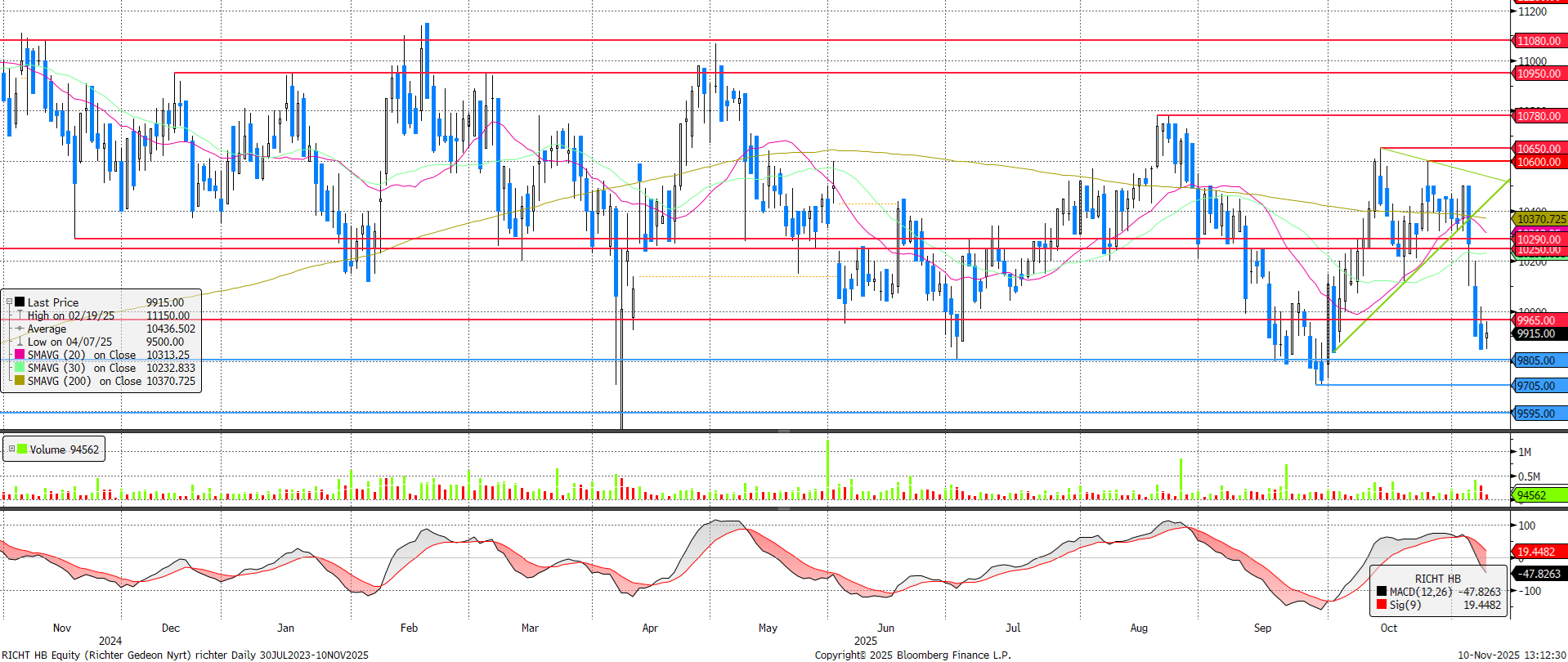 Csalódást keltett a Richter harmadik negyedéves eredménye. Ennek hatására a beékelődő háromszög alakzatból lefelé tört ki az árfolyam. A kurzus az elmúlt egy éves oldalazó sáv alsó élének (9.805 forint) közelébe esett, így fordulatra és az árfolyam emelkedésére számítunk, bár az egyértelmű fordulós jelzések egyelőre még hiányoznak.