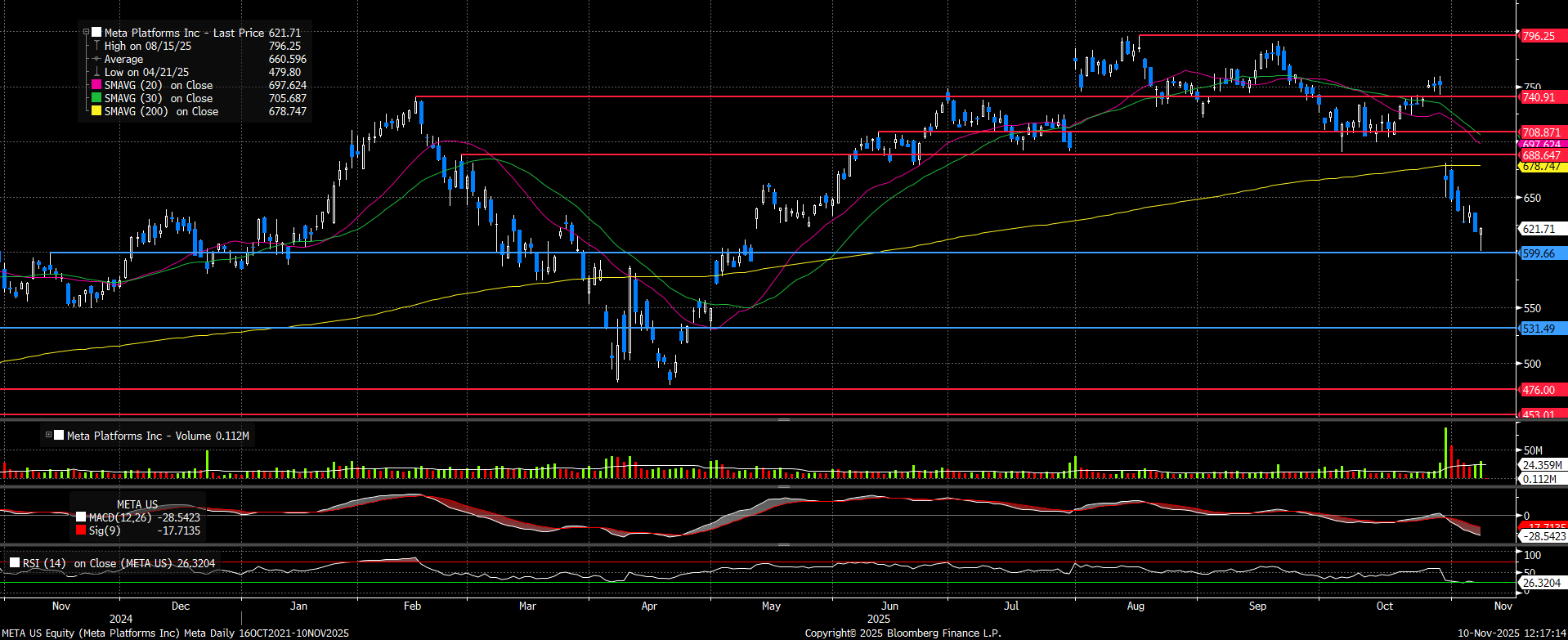 A negyedéves jelentést követő korrekció során az árfolyam több, mint 20%-ot esett, de november 7-én pénteken már emelkedni tudott, és épp fordulni próbál a 600 dolláros támaszszintről. Az RSI indikátor jelenleg is túladottságot jelez, és ennél alacsonyabb értéket csak idén áprilisban mutatott, amikor az egész tőzsde beesett a Trump-féle vámok bejelentése után. Azelőtt pedig csak 2022 novemberében. Az árfolyam áprilisban 490 dollár, 2022 novemberében 90 dollár alatt volt. A historikus adatok tehát azt mutatják, hogy a Meta hamar képes felállni az ütésekből, és ilyen szintű túladottság ritka a vállalat esetén.