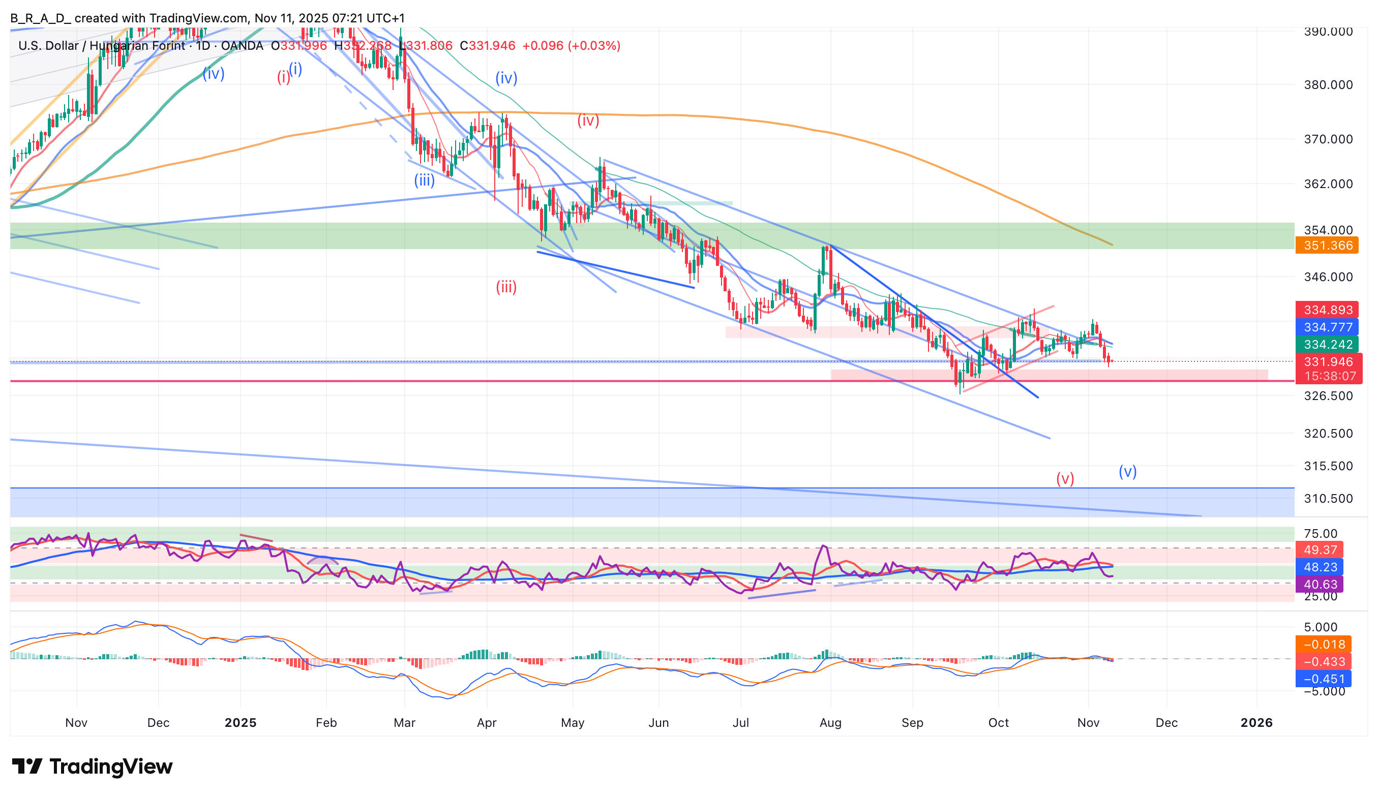 A következő időszakban – alacsony megbízhatósággal – további esésre és a korábbi másodlagos célár (330), elérésére számítunk.