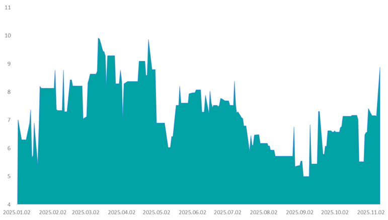Az Ural és a Brent típusú kőolajféleségek közti árkülönbség az október végén tapasztalt 5-6 dollárról a napokban közel 9 dollárra ugrott hordónként. Ez a növekedés egyértelműen a november 21-én életbe lépő, az orosz Rosznyeft és Lukoil elleni amerikai szankcióknak köszönhető. Ki kell persze emelni, hogy az Ural piaca 2022 óta lényegesen átláthatatlanabb lett: az általálunk használt ár, a Reuters által becsült mediterrán Ural valószínűleg kismértékben eltér a piac által követett indiai áraktól. De így elmondható, hogy a szankciók igenis hatnak az oroszokra, az olajvállalataik csak nagyobb diszkonttal tudnak túladni kőolajtermékükön a világpiacon.