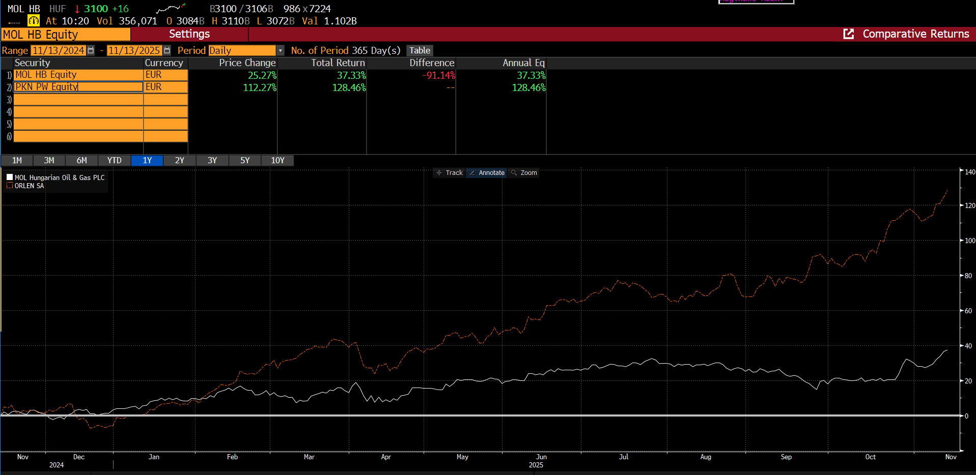 A két cég eltérő pályán mozog. A lengyel vállalatnál a PO (Polgári Platform) kormány által delegált új menedzsment kezdi rendbe rakni a korábbi cégvezetés által elkövetett hibákat, és a vállalatot egy fenntarthatóbb és átláthatóbb működés felé próbálja irányítani. Emellett a szabályozó is folyamatosan szünteti meg azokat az intézkedéseket, amelyek a 2022-es energiakrízis miatt léptek életbe. Az Orlen tehát teljesen piaci körülmények közé kerül vissza, visszanyerve a befektetői bizalmat, bár a cég feje felett ott lebeg, hogy akár a mostani, akár egy PiS (Jog és Igazságosság) által vezetett kormány esetén visszatér az erőteljesebb állami befolyás. A piac mindenesetre megelőlegezte a bizalmat, a lengyel gazdasági aktivitás is erős volt, ami mind hozzájárult az elmúlt 12 hónap remek részvénypiaci szerepléséhez.