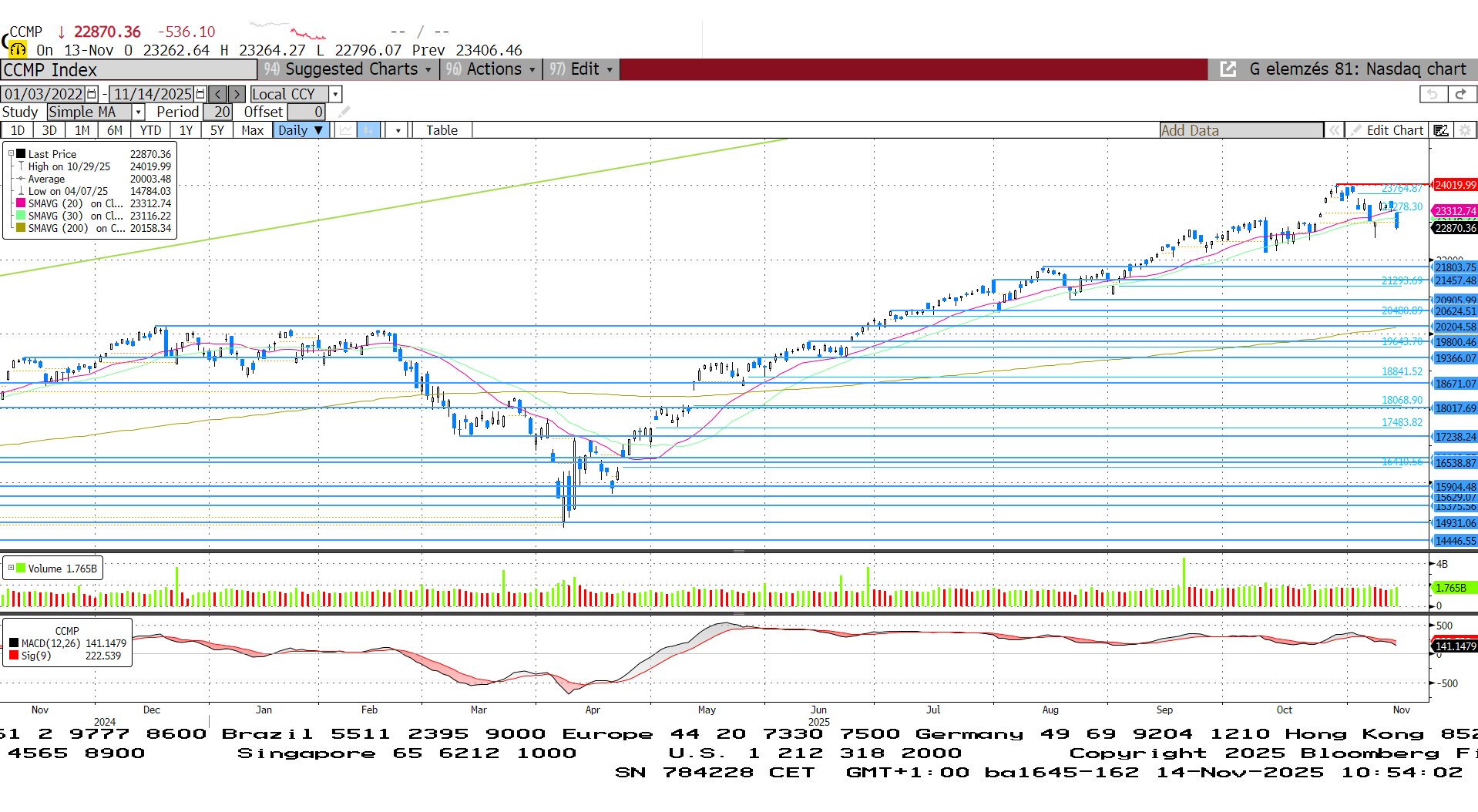 A decemberi kamatvágás elmaradásának egyre nagyobb valószínűsége elnyomta a kormányzati leállás miatti pozitív hangulatot az amerikai tőzsdén. A Nasdaq a hét eleji emelkedés után zuhanni kezdett. A 20 és 30 napos mozgóátlag nem tudta megállítani, és komolyabb támasz csak 21.804 pontnál húzódik, tehát bőven van még tér lefelé.