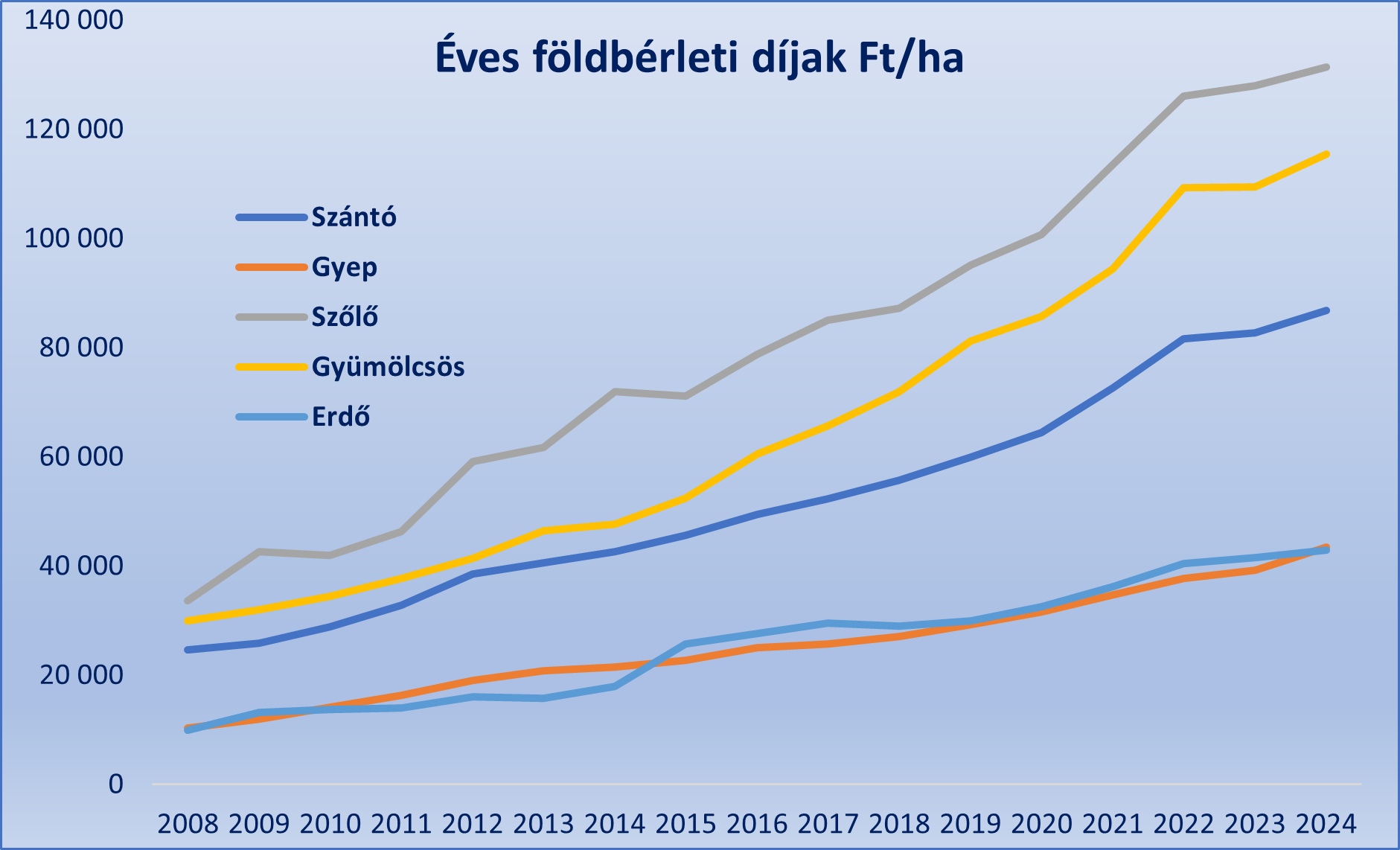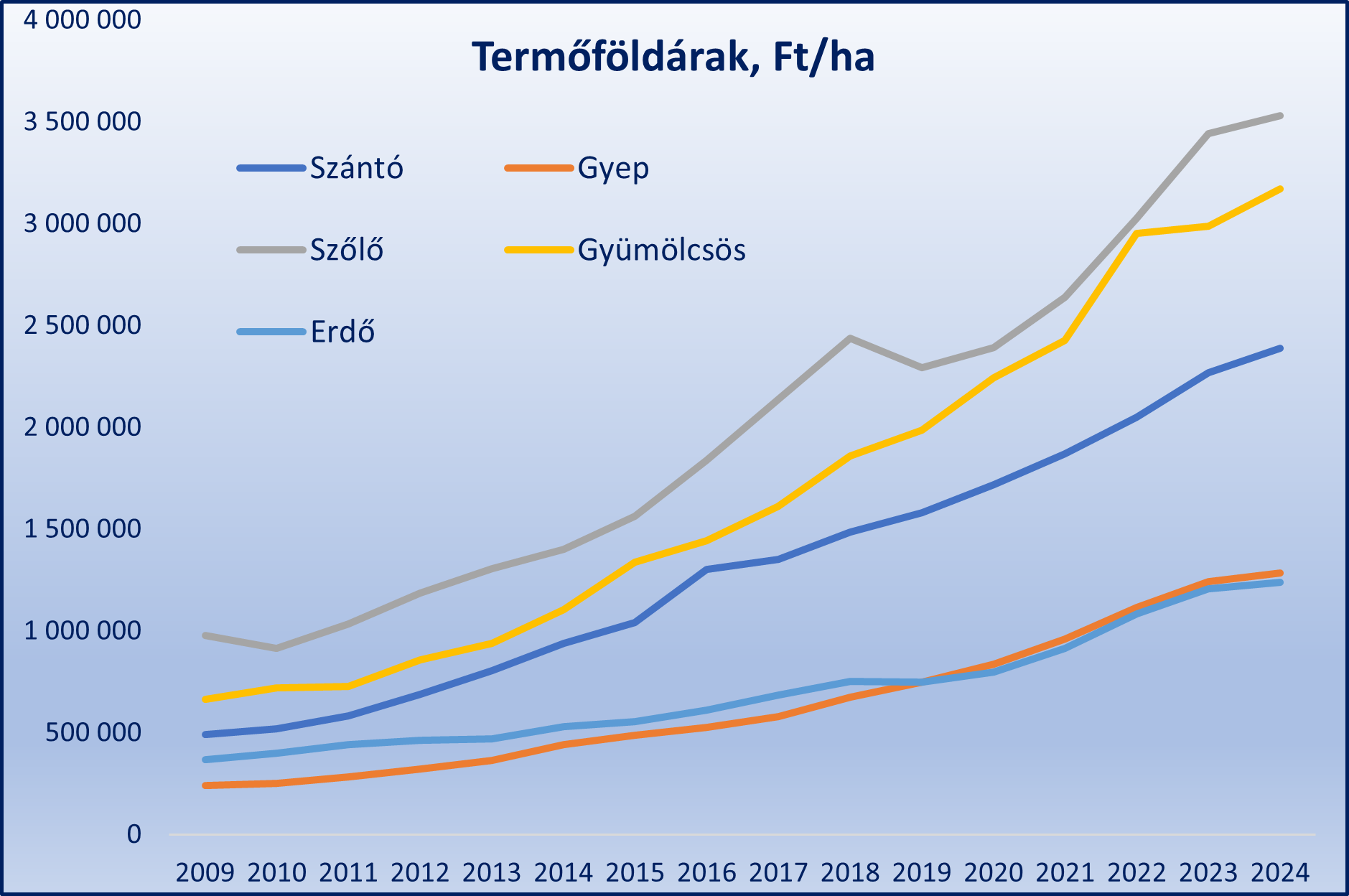 A szántóföldi növénytermesztést leginkább sújtó, a jövedelmezőséget érintő tényezők hatása tavaly már érezhető volt a termőföldpiacon. A klímaváltozás miatti mennyiségi és minőségi problémákat, a piaci árak kedvezőtlen változását kell elsősorban kiemelni, de a támogatási rendszer jövőjével kapcsolatos bizonytalanság sem tesz jót az áraknak. Ezek a hatások ebben az évben is jelen vannak. A földpiac élénkül. 2024-ben 12 százalékkal több föld cserélt gazdát. A mező- és erdőgazdasági területek ára átlagosan 4,6 százalékkal volt magasabb, mint egy évvel korábban. A legjelentősebb művelési ág, a szántó átlagára 2,4 millió forint volt hektáronként. A földbérleti díjak az előző évi stagnálás után újra emelkedtek: 2024-ben egy hektár szántót az előző évinél 5,1 százalékkal magasabb áron, 86 900 forintért lehetett bérbe venni. Az ország mező- és erdőgazdasági hasznosítású területeinek 1,0 százaléka, összesen 73 ezer hektár cserélt gazdát. Ez az adat emelkedést jelent. Egyre többen válnak meg földjüktől.