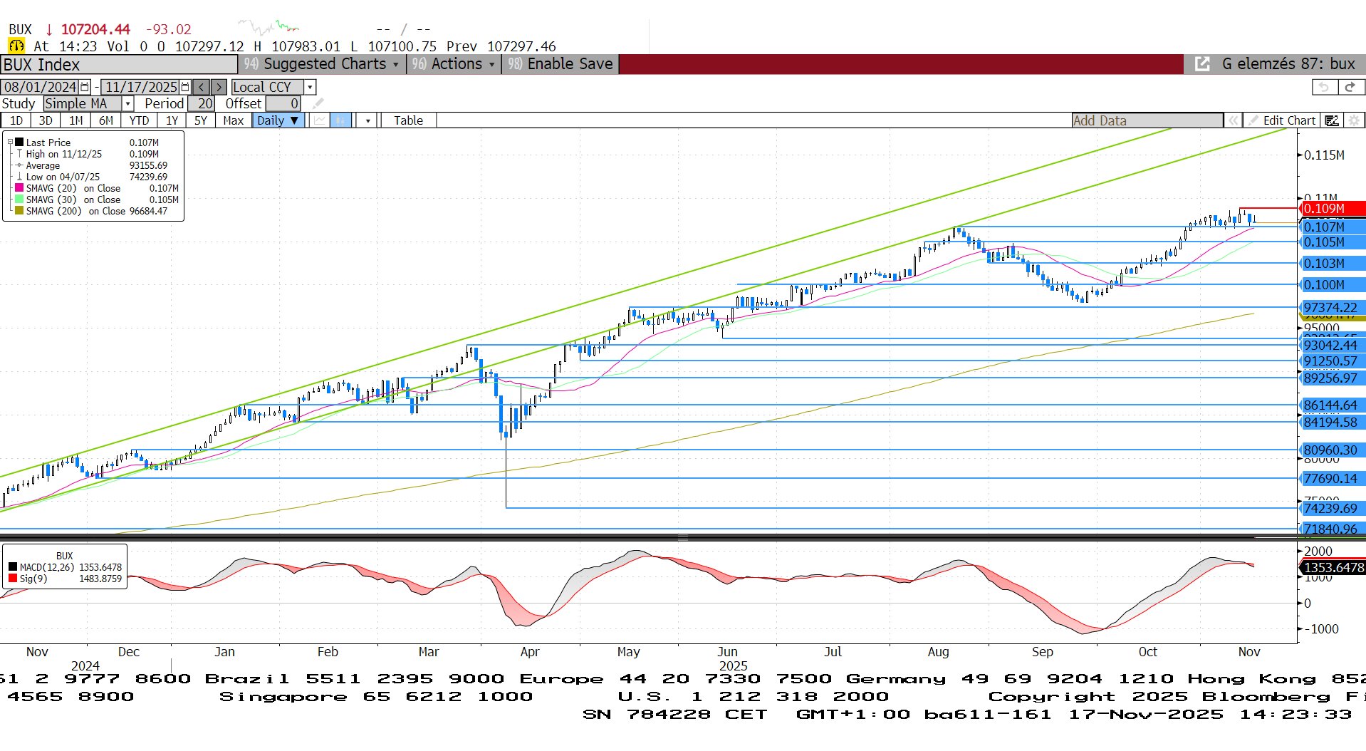 A múlt héten új történelmi csúcsra emelkedett a BUX index a Trump-Orbán találkozó miatti optimizmus nyomán, de eközben már túlvetté vált, és lefordulás következett. Az MACD indikátor is eladási jelzést adott, ami arra utal, hogy folytatódhat a korrekció. A 107.000 pontos szint és a 20 napos mozgóátlag azonban támaszt nyújthat.