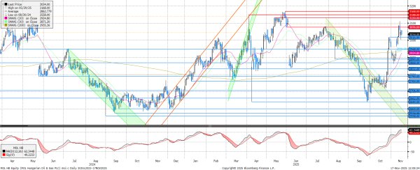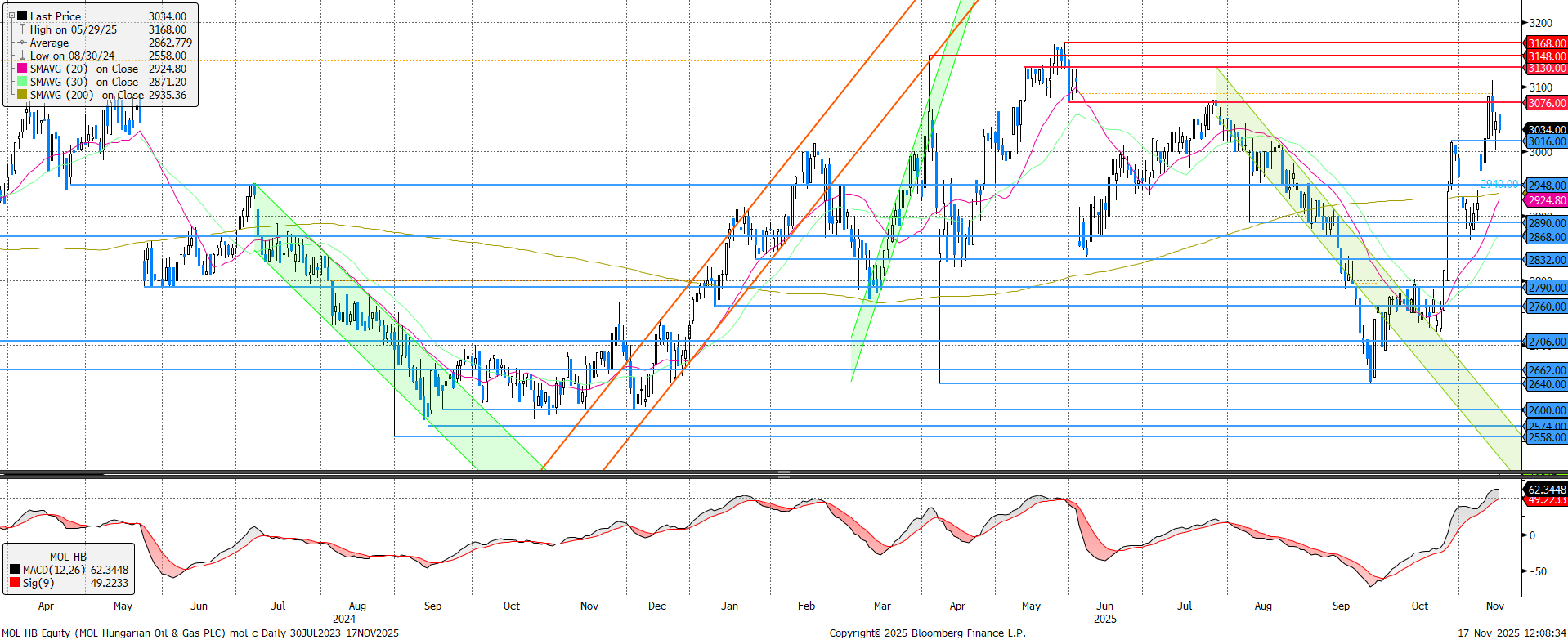 A MOL jegyzése a szerb NIS-be történő 11,3%-os bevásárlásának okán napon belül 3.100 forintra emelkedett a múlt héten. Az optimizmus viszont rövid életű volt, ezt követően a 3.000 forintos lélektani szint előtt fordult a jegyzés. Míg ellenállást a 3.076 forintos júliusi lokális csúcs nyújt, addig támaszt 3.016 forintnál találhat, és várhatóan ebben a zónában marad az árfolyam.