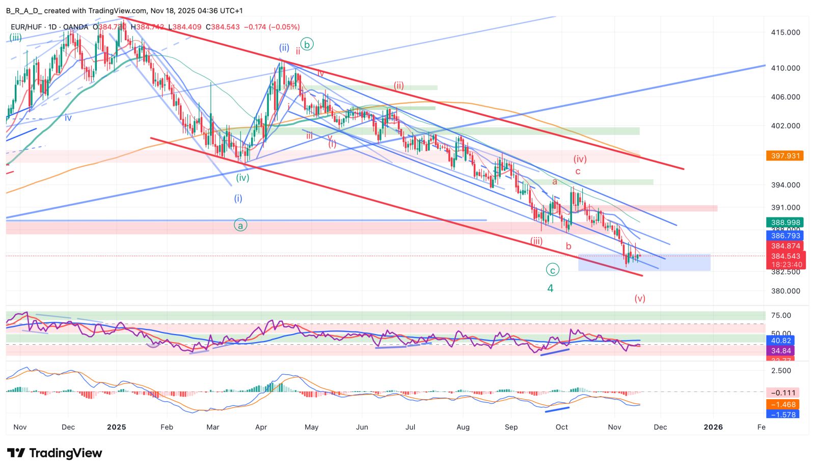 A 10 napos mozgóátlag megállította az emelkedést, lefordult róla az árfolyam. A felfelé mozgás korrekciós jegyeket hordoz, így a teljes kép alapján további forinterősödésre és újabb lokális aljra lehet számítani a korrekció befejezését követően.