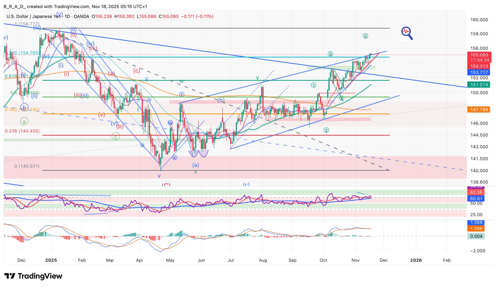 Intraday idősíkon kialakult egy fordulós divergencia, megerősítéséhez 154,800 letöréséhez van szükség, amennyiben ez sikeres, akkor 60% eséllyel éri el a 153,600 körüli szinteket.