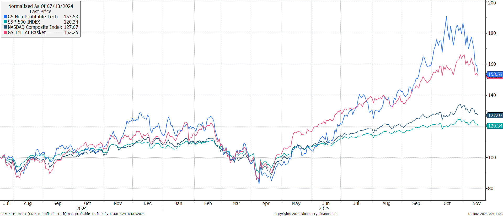 A növekedési hit és a jelentős kockázatvállalási hajlandóság hajtotta idén az amerikai részvénypiacot. Elég megnéznünk, hogy az AI részvényindex mennyire felülteljesítette a Nasdaq-ot, de még ezt is felülmúlta a nem nyereséges technológiai részvényekből álló index teljesítménye, ami kimondottan erős kockázatvállalási hajlandóságra — mondjuk ki: mohóságra — utal.