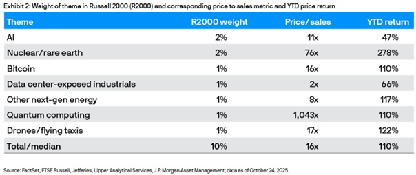 A J.P. Morgan a lenti táblázatban összegyűjtötte, hogy mely témák számítottak az idei évben slágernek. Egyértelműen a tech kötődésű és erősen spekulatív befektetések domináltak. Ezek a témák a Russel 2000 indexen belül összesen 10%-os súlyt tesznek ki, és tipikusan 110%-os emelkedést értek el. Feltételezve a hozamok normálishoz közeli eloszlását azt látjuk, hogy ezek 11%-kal járultak hozzá a Russel 2000 emelkedéséhez. Vagyis a részvények maradék 90%-a mindössze pár százalékponttal javította a Russel 2000 teljesítményét, vagyis egy rendkívül koncentrált részvénpiaci emelkedés szemtanúi vagyunk/voltunk. Egy ennyire koncentrált emelkedés pedig nem az egészséges piacok jellemzője, nem véletlen, hogy egyre többen fejezik ki aggodalmukat a tech szektor magas értékeltsége miatt.
