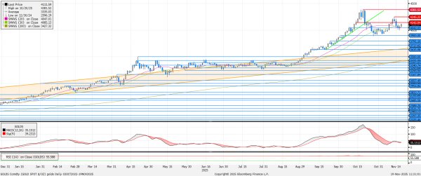 A Fed kevesebb eséllyel vág decemberben kamatot, ami kisebb ütést mért az aranyra. Azonban a nemesfémbe vetett hit egyértelműen ott van, a 4.042 dolláros támasz a kereskedési nap végén a 20 napos mozgóátlaggal kiegészülve sikeresen megfogta a három napos korrekciót, de tegyük hozzá, kellett hozzá a 4.000 dolláros lélektani szint is. A hektikus makrogazdasági adatok publikációja miatti bizonytalanság kedvez jelenleg az aranynak, de az MACD könnyedén ellaposodásba fulladhat a vételi jelzés helyett.