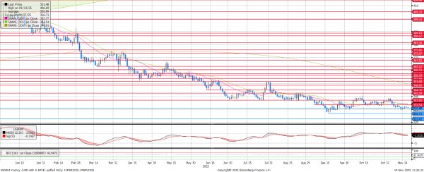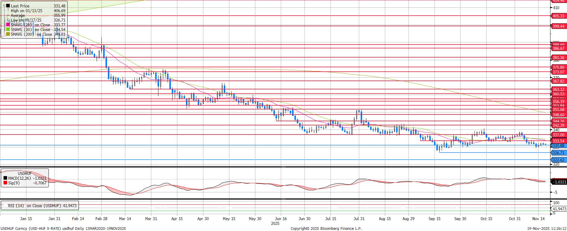 Nem történt nagy elmozdulás USDHUF fronton. Az MNB makacsul ragaszkodik a 6,5%-os alapkamathoz, Varga Mihály jegybankelnök pedig a szigorú monetáris politika fenntartását látja a megfelelő iránynak. A 20 és 30 napos mozgóátlagok fokozatosan simulnak a 333,5-ös ellenálláshoz, ami alapján nem várható felfelé kitörés. Az RSI alacsony és az MACD negatív értékébe akár csökkenést is lehet vizionálni, azonban a 330,9-es támasz erősnek bizonyulhat rövidtávon.