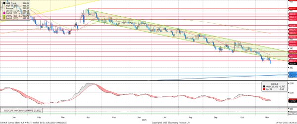 Az MNB vasmarokkal fogja a jegybanki alapkamatot, és a következő közel fél évben ez szinte biztosan így is maradhat. Ezzel pedig át is törte a legutóbb 2024 májusában látott 383,5-ös szintet az árfolyam. Egyelőre az RSI szerint még nem túladott, és az MACD is azt mutatja, hogy van még mozgástér lefelé.