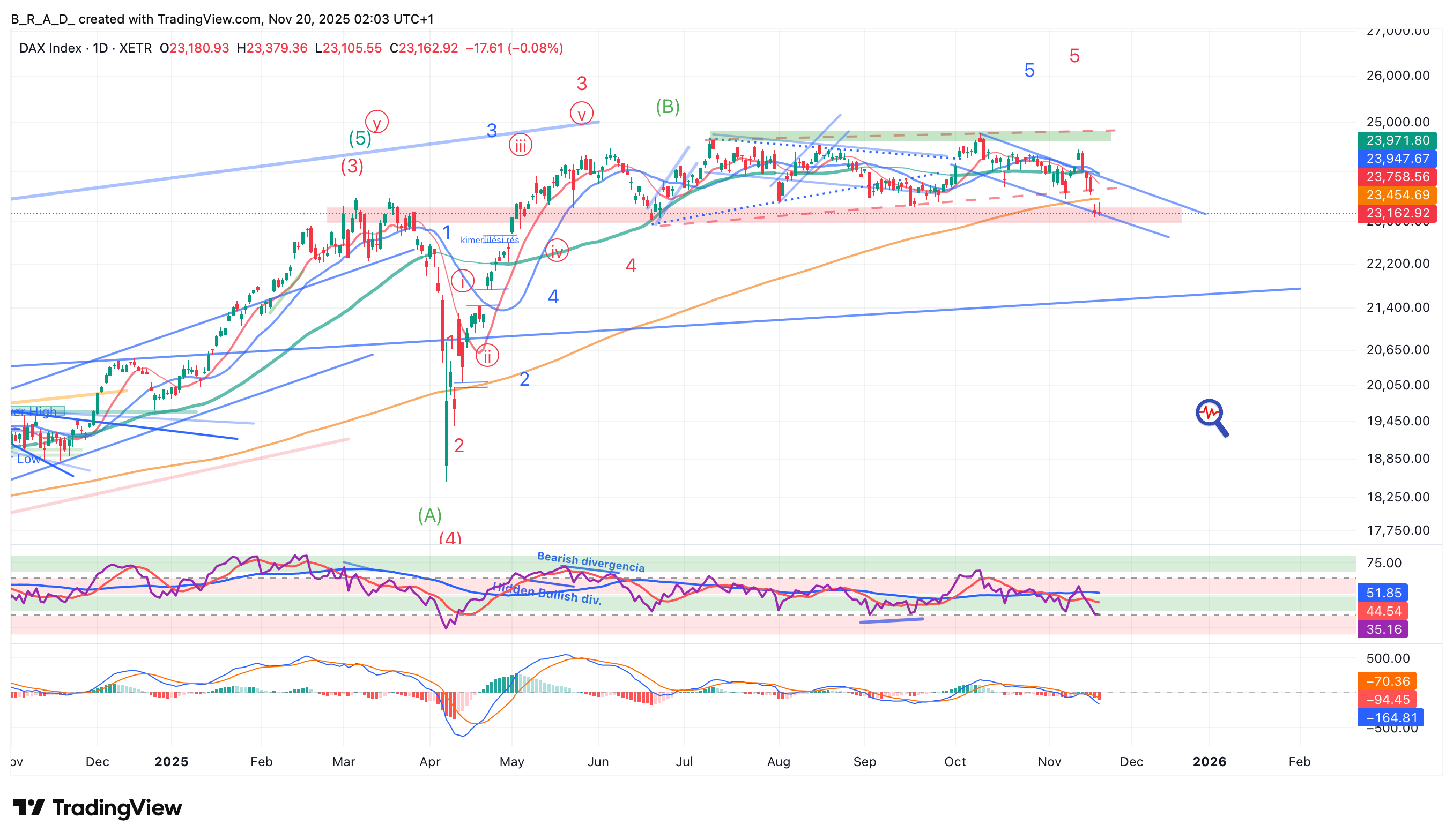 Egyelőre egy támaszzónában tartózkodik az árfolyam, mely tulajdonképpen a 2025 közepe tartó oldalazás alja, a szint törése hatalmas teret nyithat meg az index előtt.