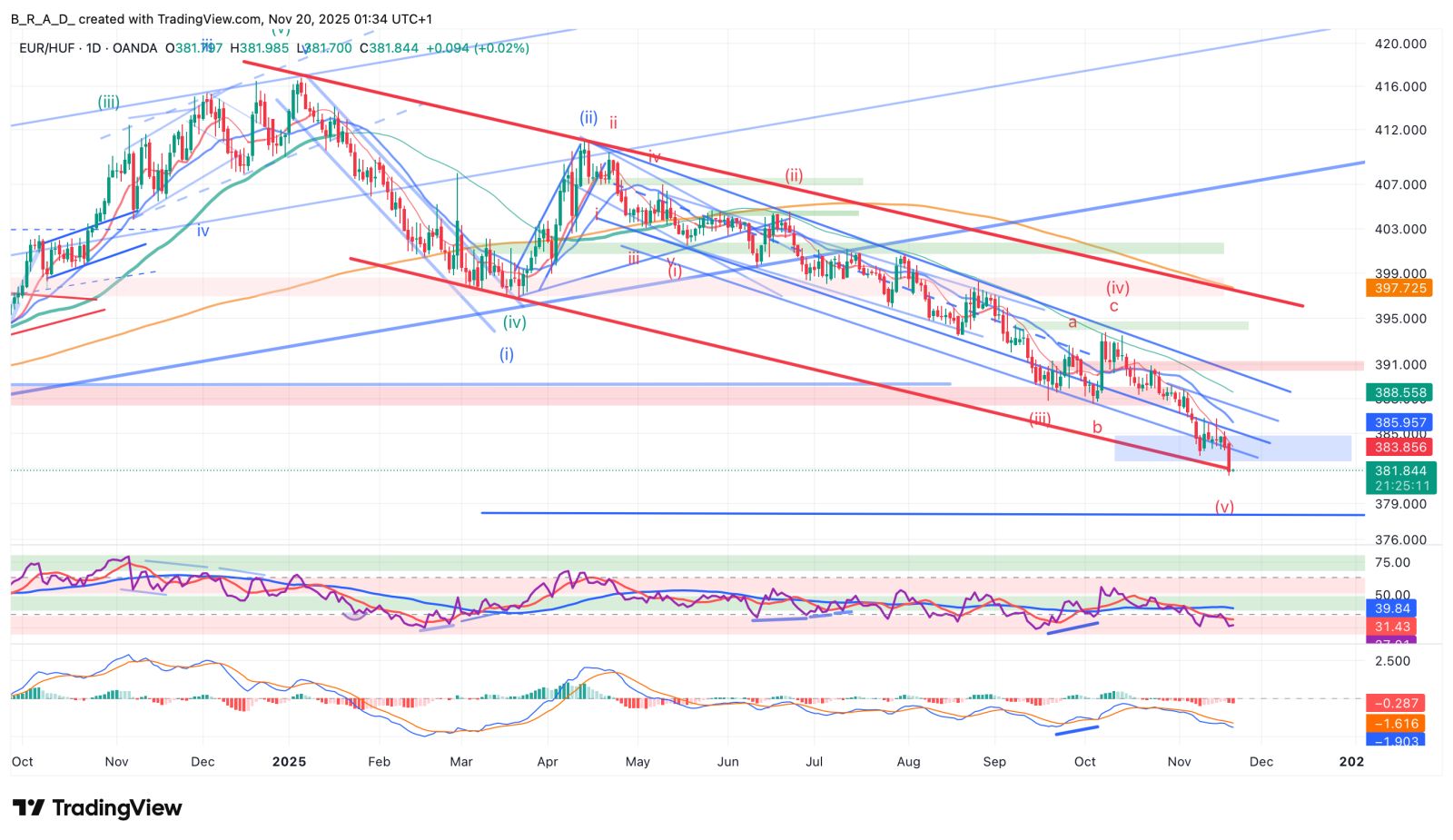 Havi idősíkon ellenálláshoz közeledik az árfolyam, azonban itt még akár több forint esés is elképzelhető a megtámaszkodás előtt. A hetes idősíkon a mozgás mért, egyik lehetséges célára 378 környékére mutat, azonban ezen az idősíkon, ilyen időtávon a célártól való eltérés pár forint is lehet, azaz már elértük azt a zónát, mely megállíthatja a forint erősödését. Az indikátor képek alapján azonban egy felfelé mozgás nagy eséllyel korrekciós mozgás lesz csak.