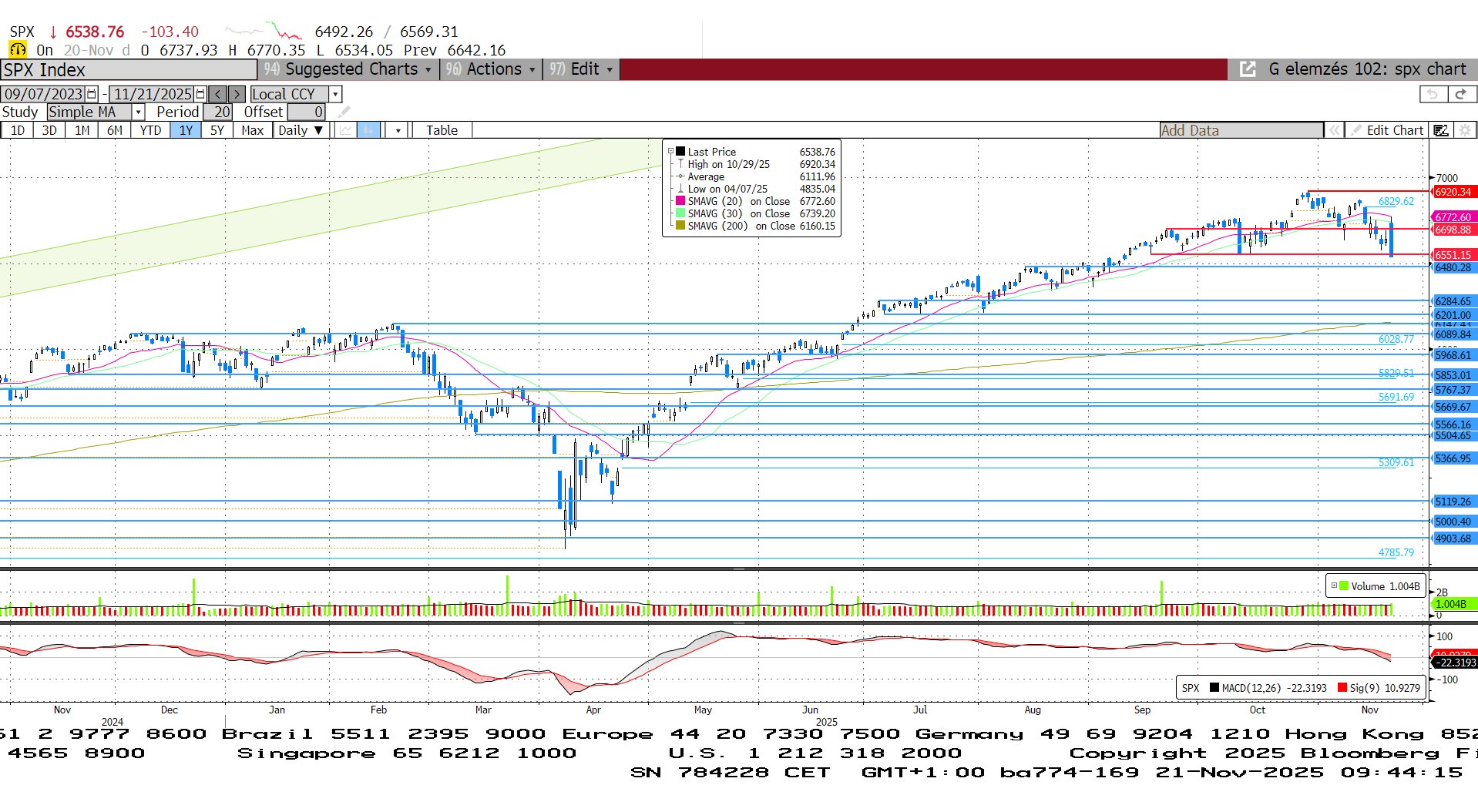 Folytatódott a korrekció az amerikai tőzsdéken. Az S&P 500 esését a 6.699 és a 6.551 pontos támasz sem tudta megfékezni. Csütörtökön jókora emelkedéssel indult a nap, de a 20 és 30 napos mozgóátlagot nem tudta áttörni, és végül negatívban zárt az index. Az RSI indikátor közelít a túladottsághoz, így hamarosan megállhat az esés.