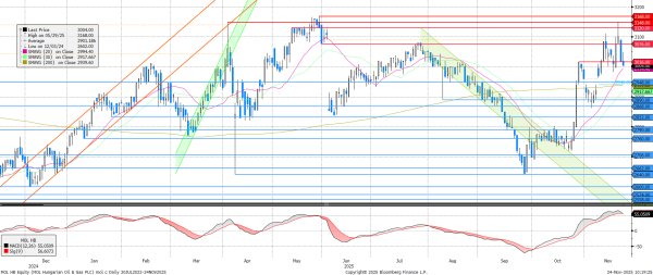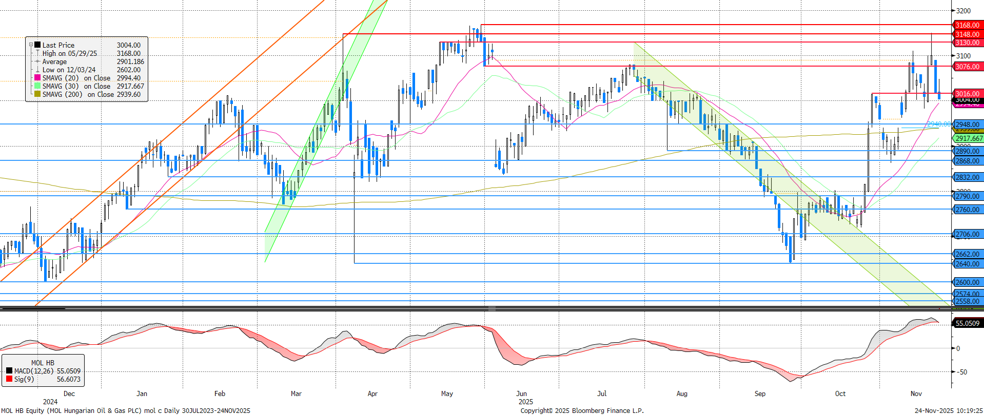 Erőteljes csapkodás és hirtelen irányváltások jellemzik a MOL kurzusát. Ma reggel elesett a 3.016 forintos támaszszint, mely innentől ellenállásként funkcionál, miközben az MACD indikátor magas értéken adott eladási jelzést, így rövidtávon a csökkenés irányába mutat a technikai kép. Első körben a 20 napos mozgóátlag jelenthet támaszt, ez alatt pedig egy erős támaszszint található a 2.940-2.948 forint közötti szűk tartományban, ugyanis itt húzódik a 200 napos mozgóátlag, egy támaszszint és még egy a hó elején hagyott rés alsó éle is.