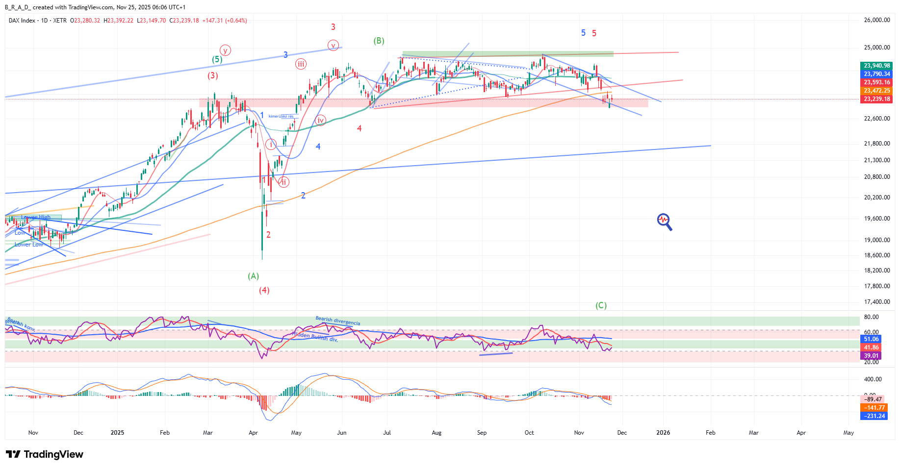 Egyelőre egy támaszzónában tartózkodik az árfolyam, mely tulajdonképpen a 2025 közepe tartó oldalazás alja, a szint törése hatalmas teret nyithat meg az index előtt.