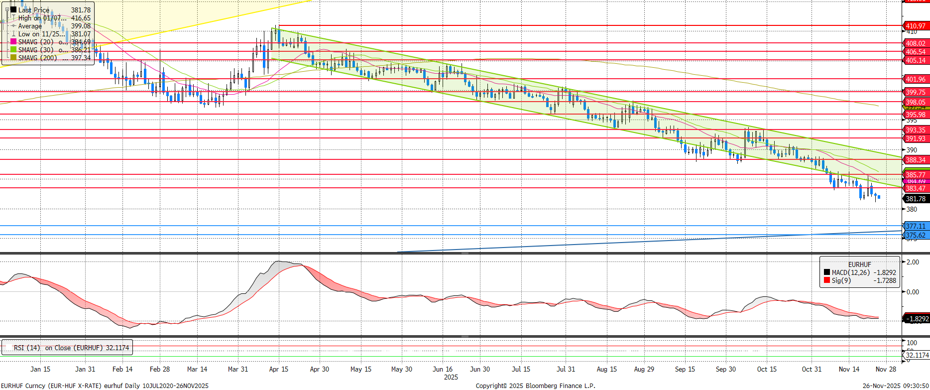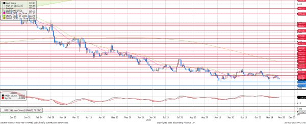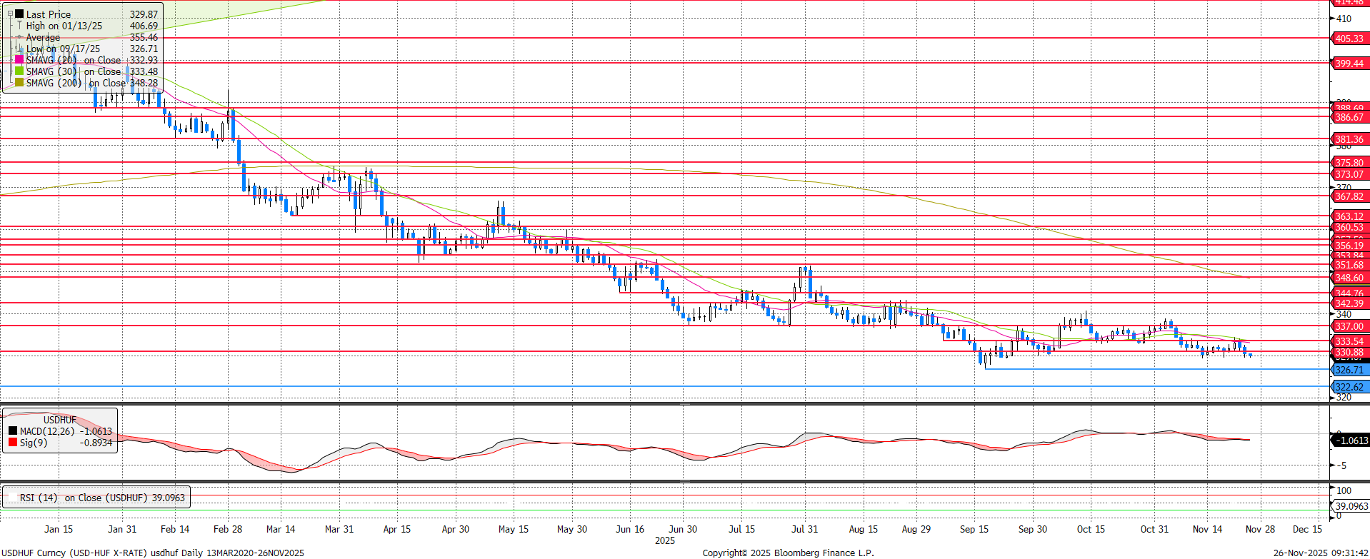 A Fed decemberi kamatcsökkentési esélyek jelentős növekedése segítette a forintot, így fokozatos csökkenés mellett a 330-as szint környékére került az árfolyam. Az MACD a negatív tartományban ellaposodott, ami további árfolyamcsökkentő hatással bírhat. Az RSI szerint még nem vált túladottá az USDHUF, vagyis elképzelhető, hogy a szeptemberi lokális minimum adta 326,7 felé meneteljen tovább.