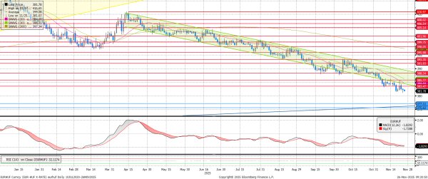 Virág Barnabás MNB alelnök pénteki lemondása csak átmenetileg rontott a forinton, a jegyzés könnyedén visszatért a 383,5-ös szint alá. Az RSI 32-es szintje továbbra is hagy teret a lefelé történő mozgásnak, a „játékoscsere” pedig nem hoz változást a szigorú monetáris politikában, így akár a 380 alatti EURHUF is elképzelhető még idén.