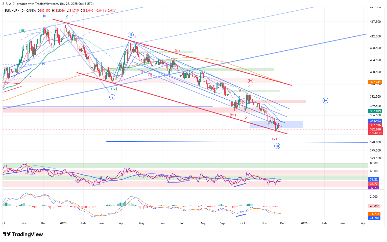 A következő időszakban a 377,80-382,50 közötti sávban mozoghat az árfolyam, melyből északi irányú kitörésre számítunk, azonban ennek időpontját nem tudjuk előre jelezni, az év végi ünnepi készülődés sok esetben a piaci folyamatok belassulásával jár együtt, így akár hosszabb ideig is maradhat a sávban az árfolyam.