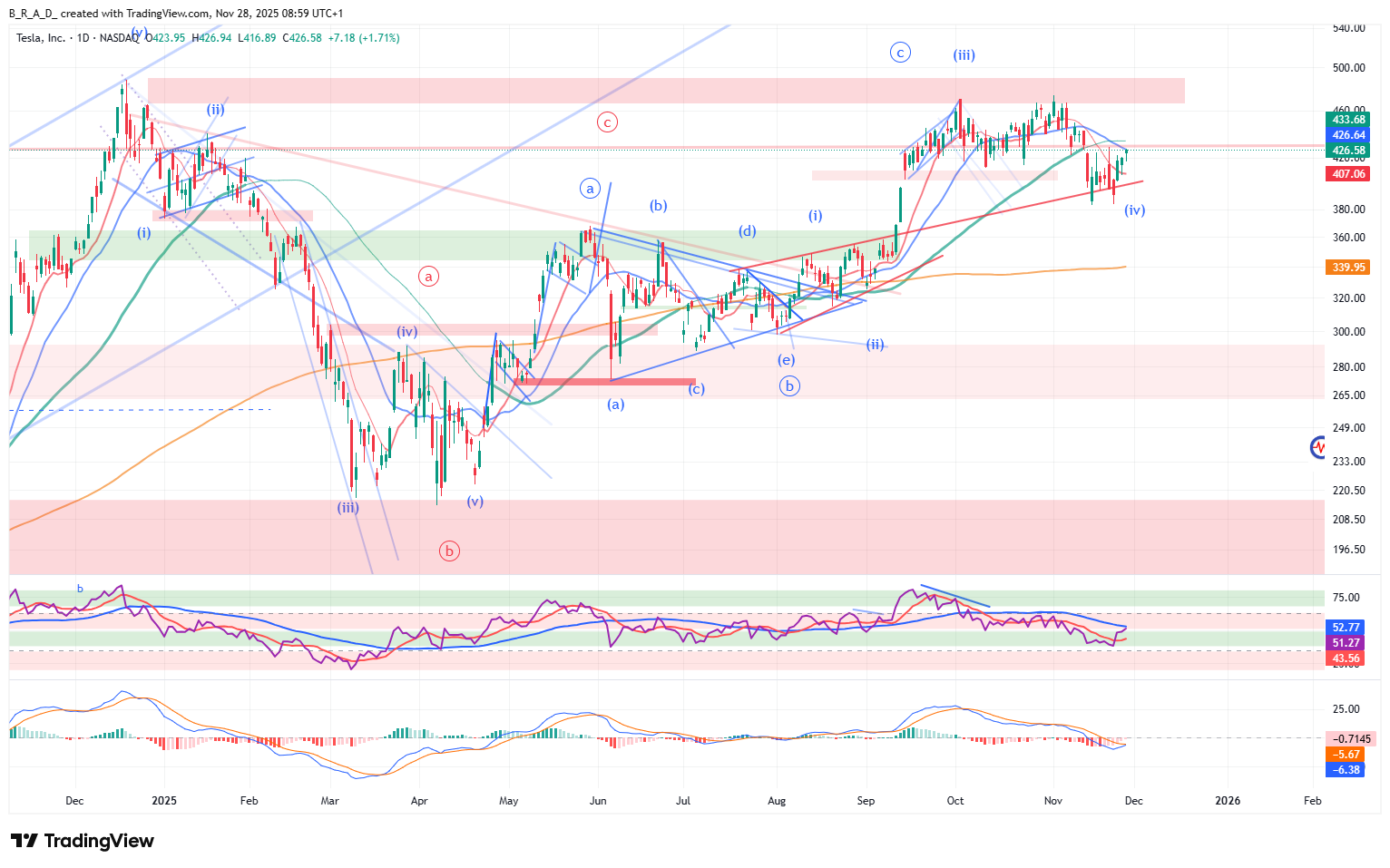 Az elsődleges számozásunk szerint elkészült egy oldalazó korrekció, mely után visszatérhet a trend és emelkedés érkezhet a piacra. Az elsődleges szcenáriónkra veszélyt jelent, hogy az 50 napos és 20 napos mozgóátlag kereszteződése állta útját a mozgásnak, ráadásul az emelkedés és a lefordulás arra utal, hogy északi irányba korrekció haladt. Egy lendületes északi irányú megindulás, 435 leküzdése az elsődleges szcenárió irányába billenti el a valószínűségeket, míg a fenti szintről, vagy pár ponttal lejjebb történő elakadás és lefordulás ez utóbbi irányába.