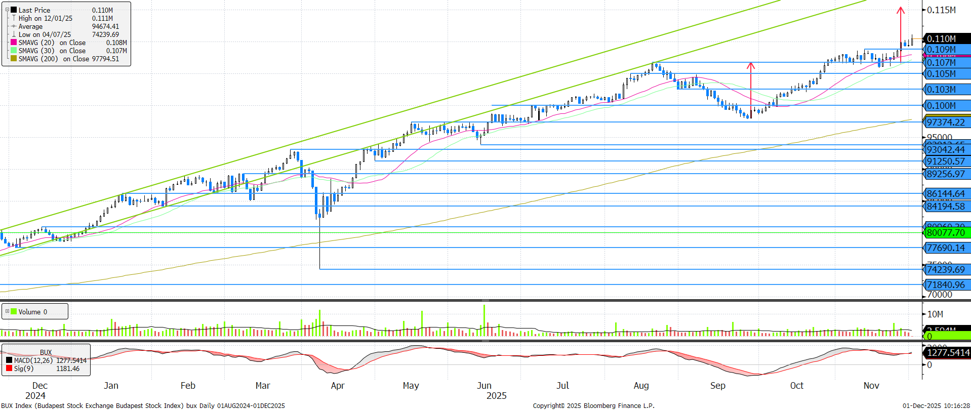 Új történelmi csúcsra ugrott a BUX és ma már 110.000 pont fölött jár az index. Ellenállást már csak a lélektani szintek jelenthetnek, a következő 115.000 pontnál látható, míg támaszt a 110.000 pontos szint jelent. Az index RSI értéke közelít a túlvettséget jelző 70 pontos értékhez.