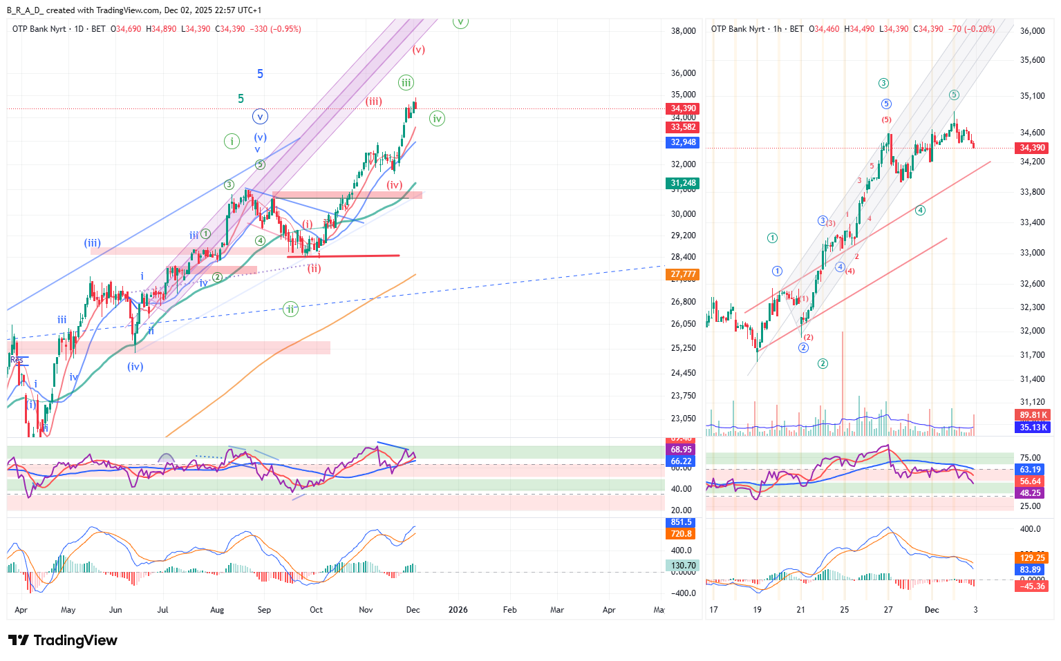 Az intraday idősíkok arra utalnak, hogy elkészült egy északi irányba tartó szekvencia, mely után korrekció érkezik déli irányba a következő időszakban. A korrekció minimálisan 34.000 alatti szinteket jelent (1h, zöld számozás).