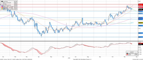 Megtörte az USDJPY emelkedő trendvonala mentén zajló mozgást a Bank of Japan a karácsony előtti kamatemelési várakozások felfokozásával. Ennek az esélye a piaci árazás szerint 80% fölé emelkedett, aminek hatására a jegyzés visszatesztelte a 154,6-os támaszt (és az itt lévő 30 napos mozgóátlagot), eredménytelenül. Ennek ellenére egy csökkenő trend látszik kirajzolódni, amit az MACD eladási jelzése is támogat.