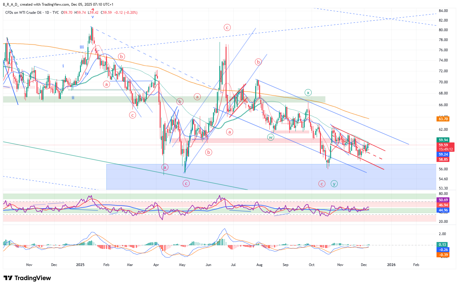 Az előttünk álló időszakban – kisebb korrekció mellett – további emelkedésre számítunk, melynek az elsődleges célára a korábbi másodlagos (60,54), a másodlagos 61,20.