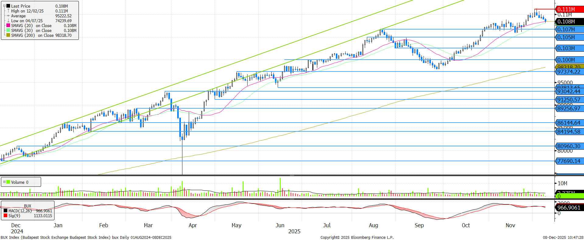 Ahogy az OTP elvesztette a lendületét, a BUX index is lefordult a 111 ezer pont fölötti történelmi csúcsról. Az MACD indikátor eladási jelzést adott, ami szintén az index csökkenését valószínűsíti. A 20 napos mozgóátlag reggel elesett, így a következő támaszszintet a 30 napos mozgóátlag jelentheti.