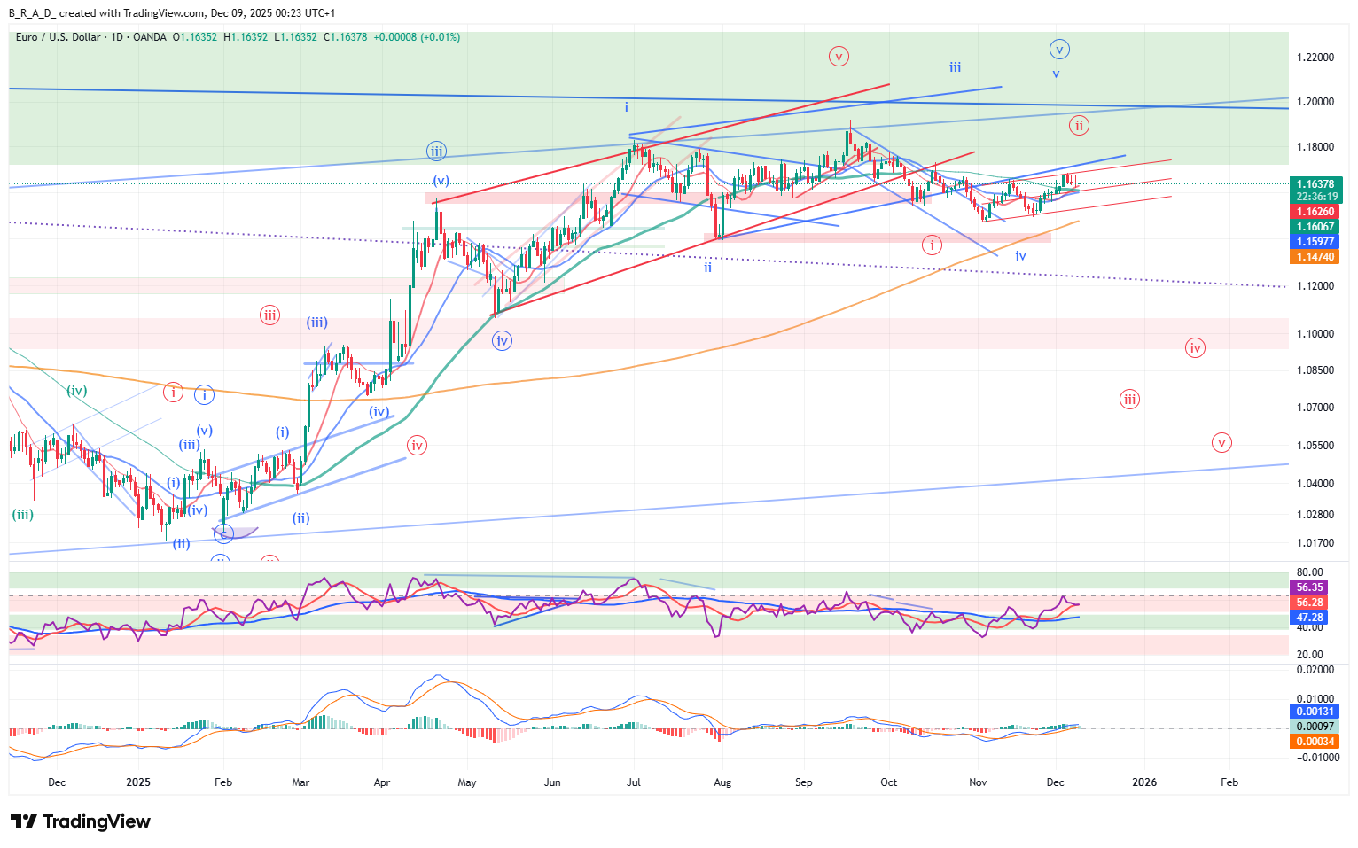 Amennyiben megfogja és a lefordulást követően a csatornaközép vonalát is letöri a piac, akkor a pirossal jelölt számozás esélye nagyon nagy mértékben megemelkedik (ebben az Ending Diagonal formáció egy csonka csúccsal ért véget), mely egy erőteljes dollár erő megjelenését hozhatná el a közeljövőben, erre a veszélyre érdemes figyelni.