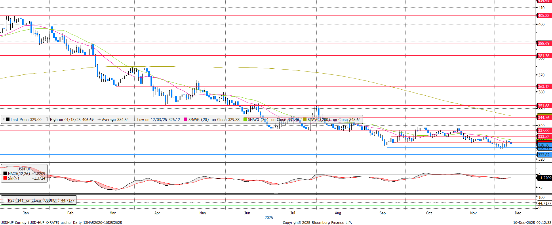 Enyhe felpattanással a 330-as szint fölé került az USDHUF jegyzése. Viszont ahogy az euró esetében, úgy a korrekciót követően a dollárral szemben is újból erősödni látszik a forint. Az MACD a negatív tartományban, de ellaposodva oldalazgat, az RSI neutrális szinten van, így inkább a Fed szerdai, illetve az MNB jövő heti döntése hathat elsősorban az árfolyamra. Idén ez jellemzően a magyar fizetőeszköznek kedvezett, de kevés hely maradt az erősödésre.