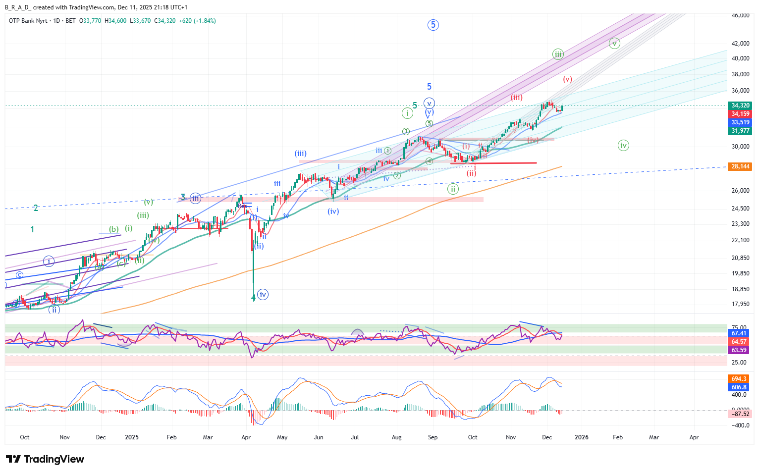 Napos idősíkon az emelkedés lendülete csökkent, a fenntartható bull zónában az indikátorok, mely alapesetben azt jelzi, hogy további emelkedés érkezhet egy korrekciót követően, a kialakult divergencia nem fordulós, azonban jelen esetben a belső szerkezetekre is tekintettel itt már nagyobb esély van arra, hogy a divergenciából egy napos idősíkon is látható esés érkezik a piacra. Amennyiben megindul a fordulat, akkor 33.000 környéki szintek elérése még további bika piacot feltételezve is reális szcenárió.