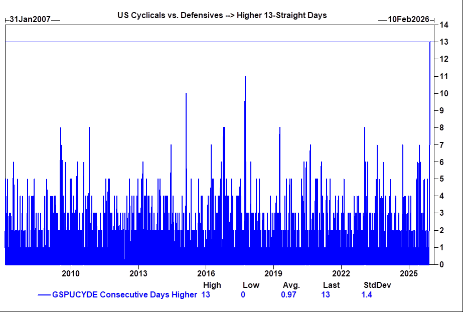 Közben a Goldman Sachs egyik írása egy érdekességre hívja fel a figyelmet, miszerint a ciklikus papírok 13 egymást követő napon felülteljesítették a defenzív részvényekből álló indexet, amire 2007 óta soha nem volt példa. Ez pedig egyértelműen azt mutatja, hogy a ciklikus papírok iránt megélénkült a kereslet a kedvező környezet eredményeként, mely trend tartósan is megmaradhat. A Goldman megfigyelése arra is felhívja a figyelmet, hogy 2007 óta, amikor legalább 8 napon át felülteljesítők voltak a ciklikus részvények, akkor az ezt követő időszakban kivétel nélkül mindig kedvező részvénypiaci hozamok voltak tapasztalhatók. A megfigyelések alapján a következő hónapban az S&P500 átlagos havi hozama 2%, három havi átlaghozama pedig 6% volt.