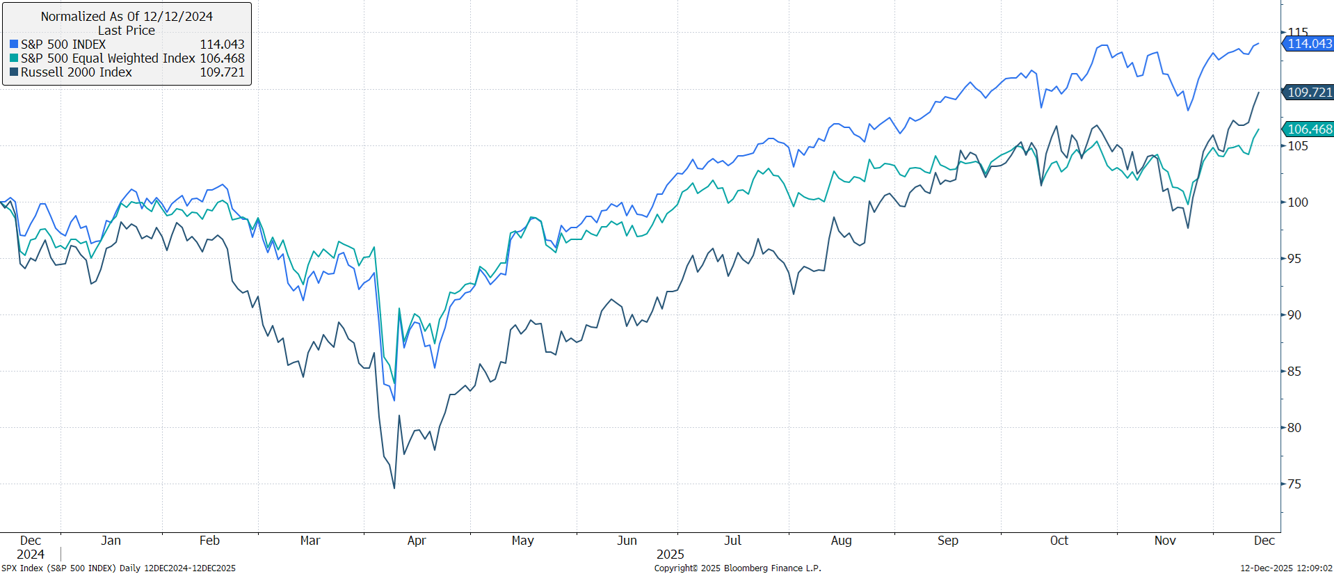 Bár az év egészét nézve még mindig jelentős az S&P 500 felülteljesítése az amerikai részvénypiacon, köszönhetően a big tech papírok kiemelkedően nagy súlyának, ám az elmúlt néhány hétben háttérbe szorultak ezek a részvények. Ezzel párhuzamosan egy hónapos távon jól látható a Russel 2000 és az egyenlő súlyozású S&P500 felülteljesítése, vagyis a kis kapitalizációjú részvények felülteljesítése az óriásokkal szemben.