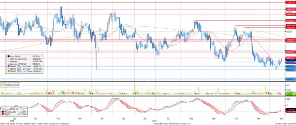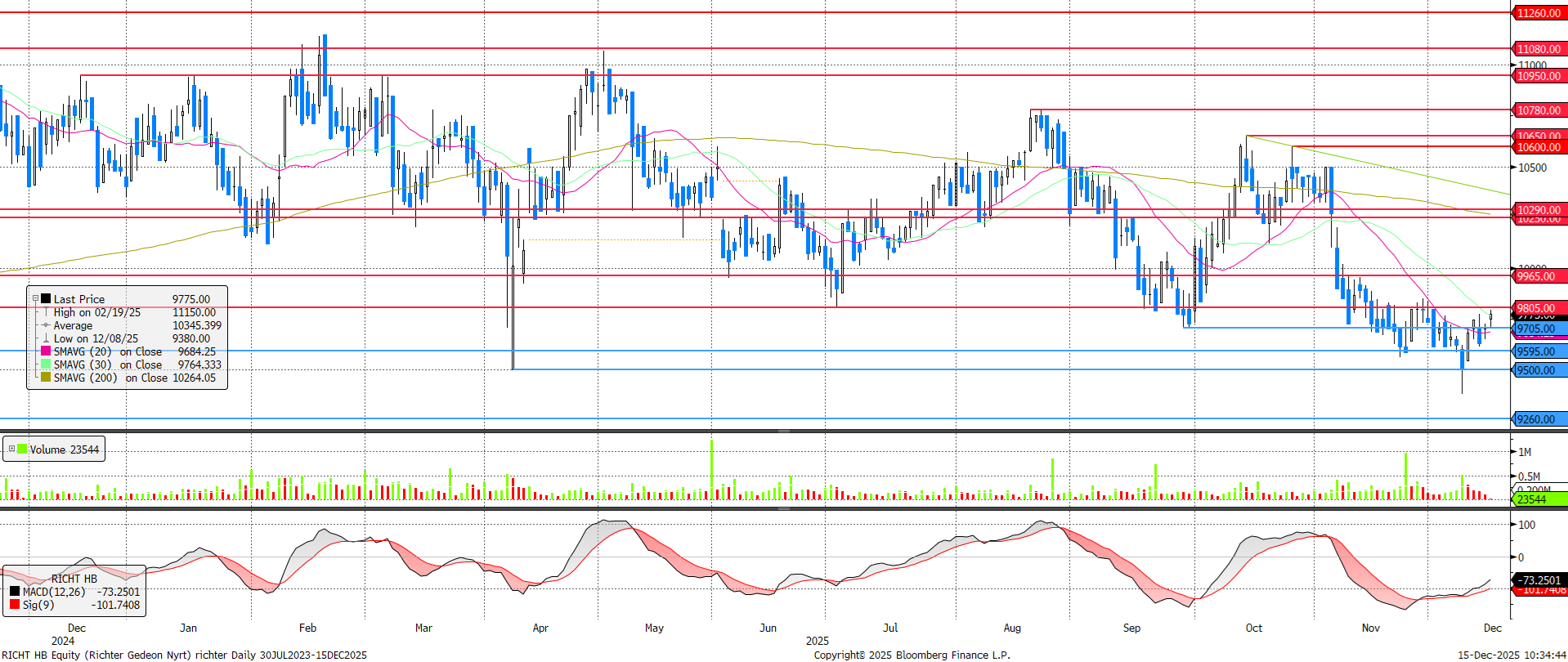 A Richter ma reggel jelentette be, hogy az FDA 6 hónappal meghosszabbította a Vraylar szabadalmi védettségét, így az 2030 márciusában fog lejárni az Egyesült Államokban. Ez egy olyan pozitív katalizátor lehet, ami támogathatja az árfolyam emelkedését. Ellenállások 9.805 és 9.965 forintnál láthatóak.